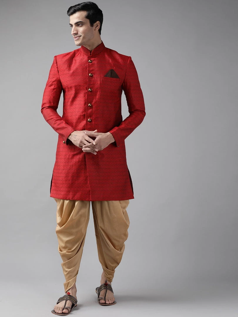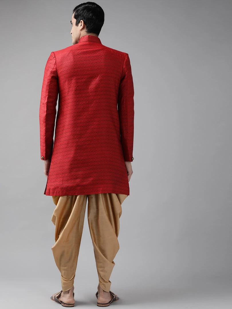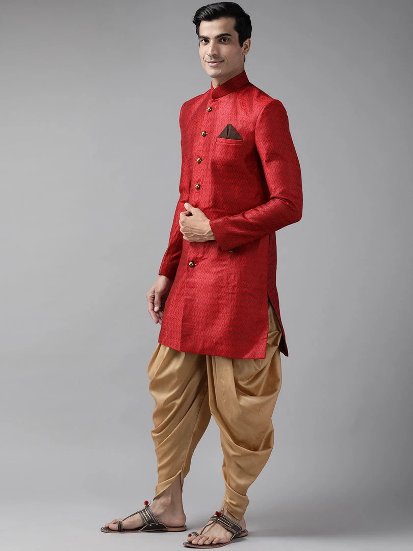 Maroon and rose gold self-design sherwani set