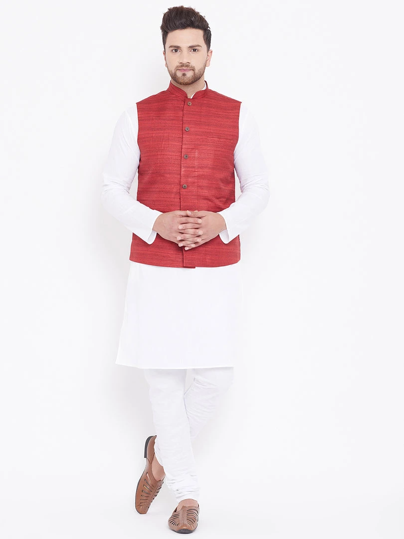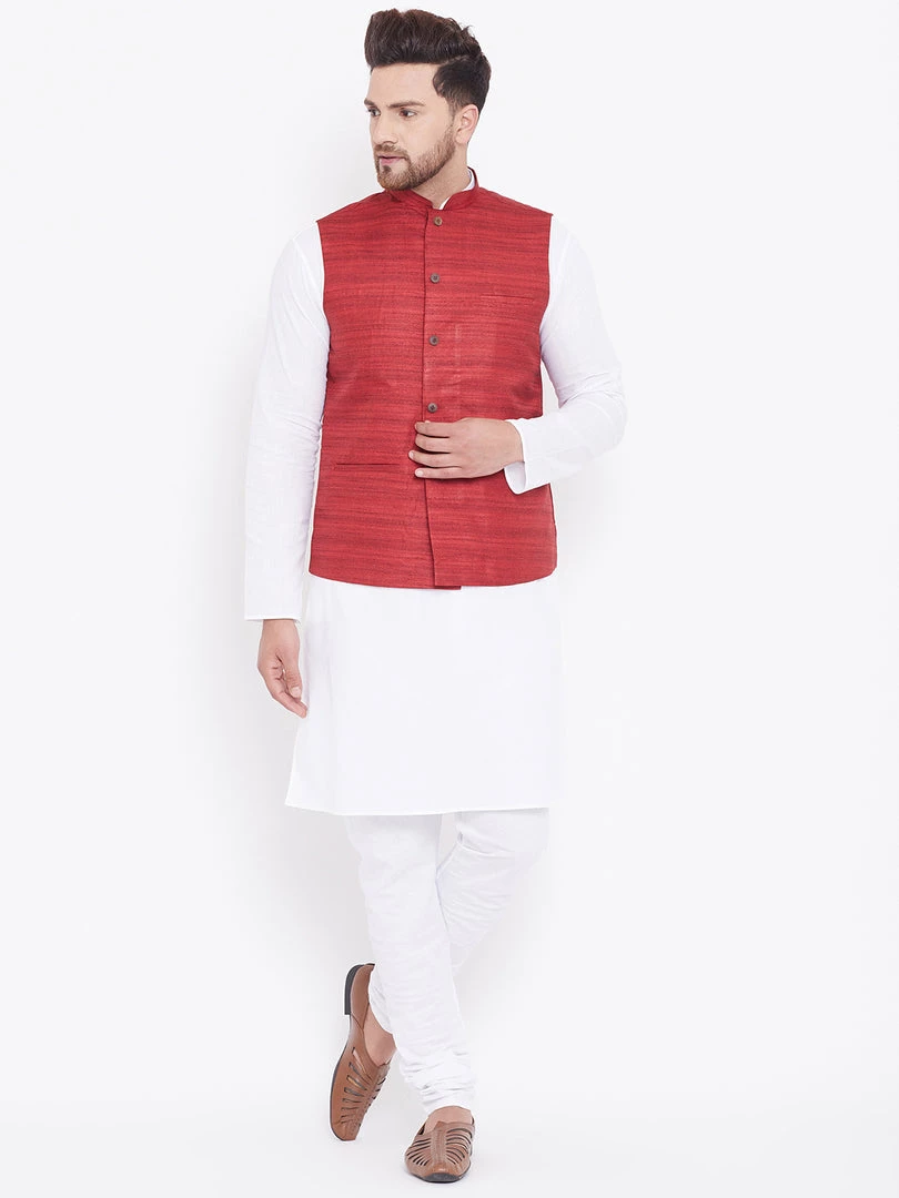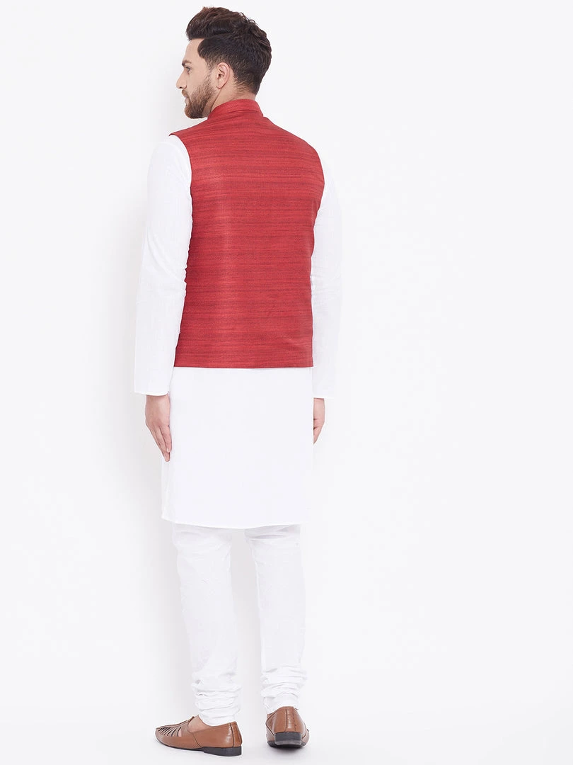 Maroon woven-design slim-fit Nehru jacket, has a mandarin collar, sleeveless, a full button placket, three pockets