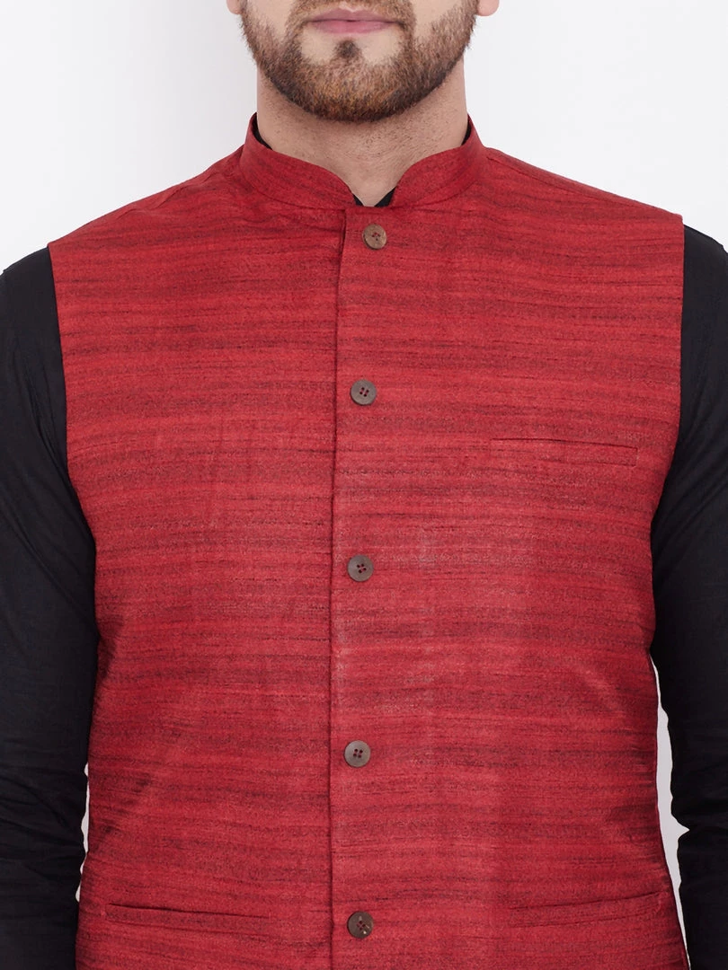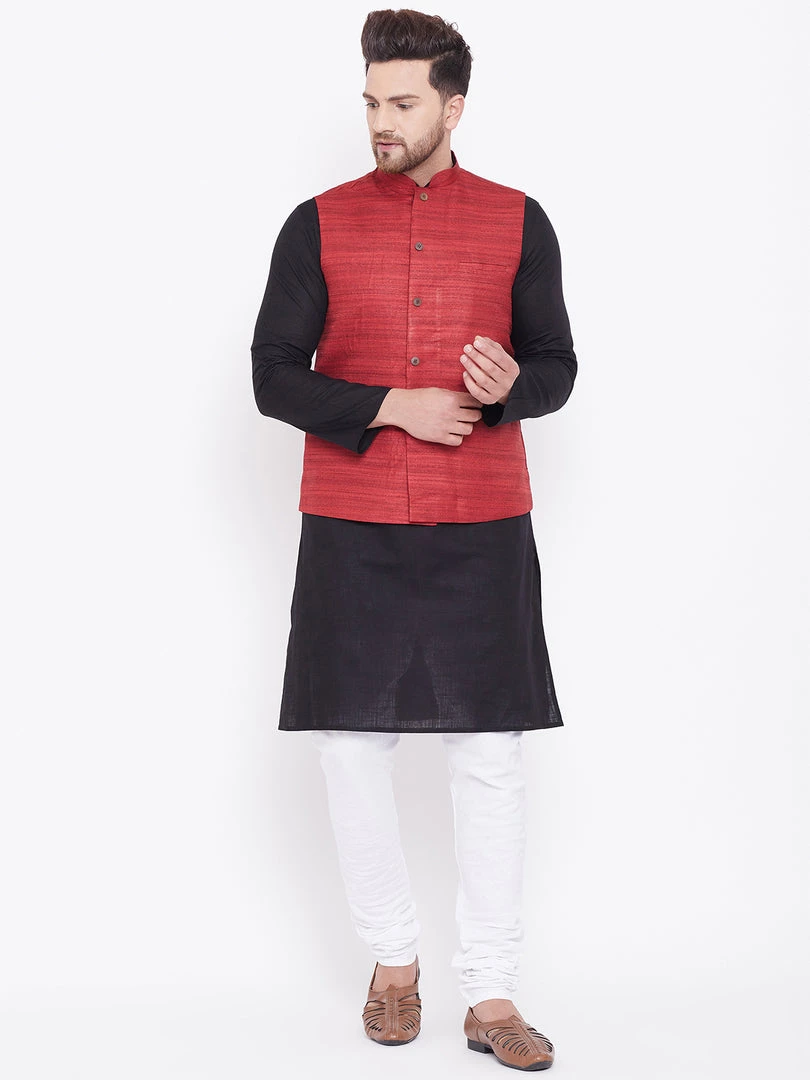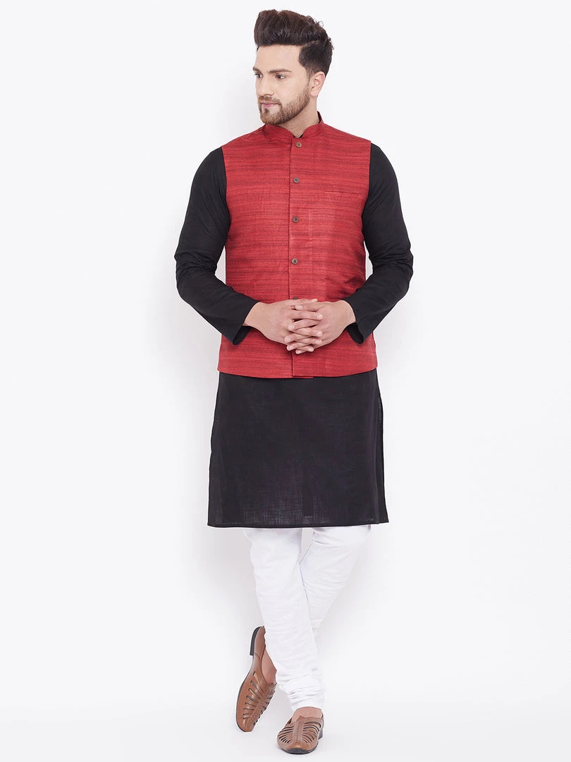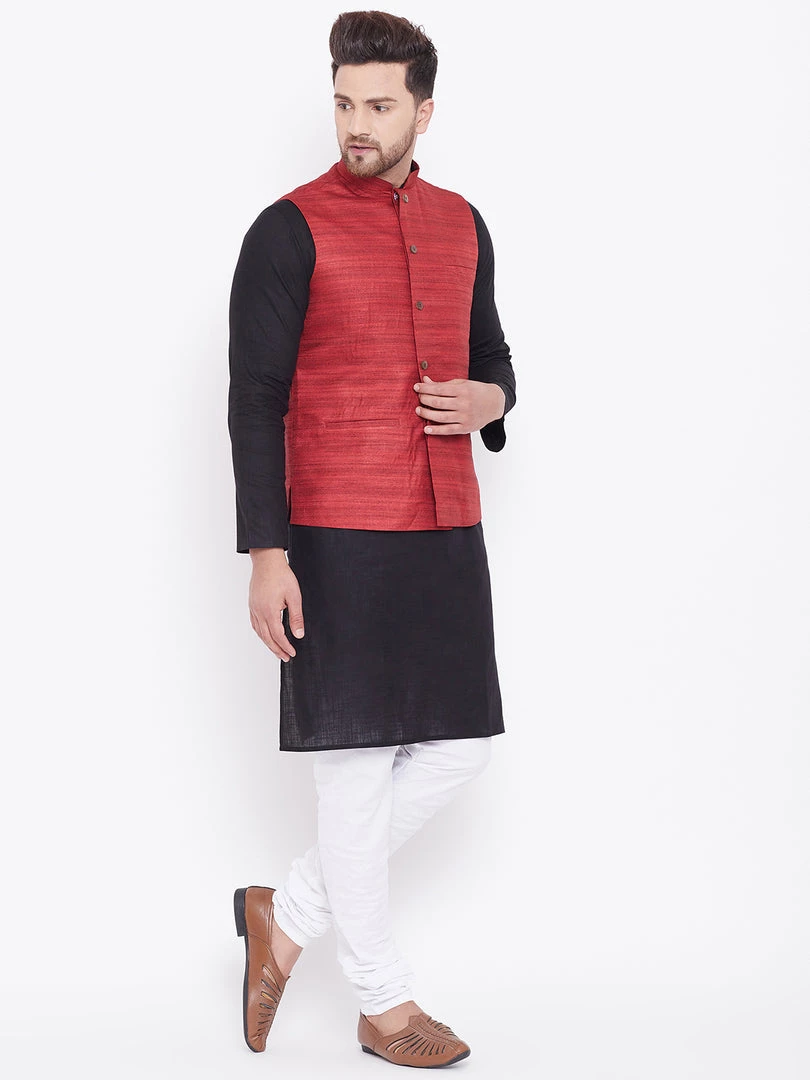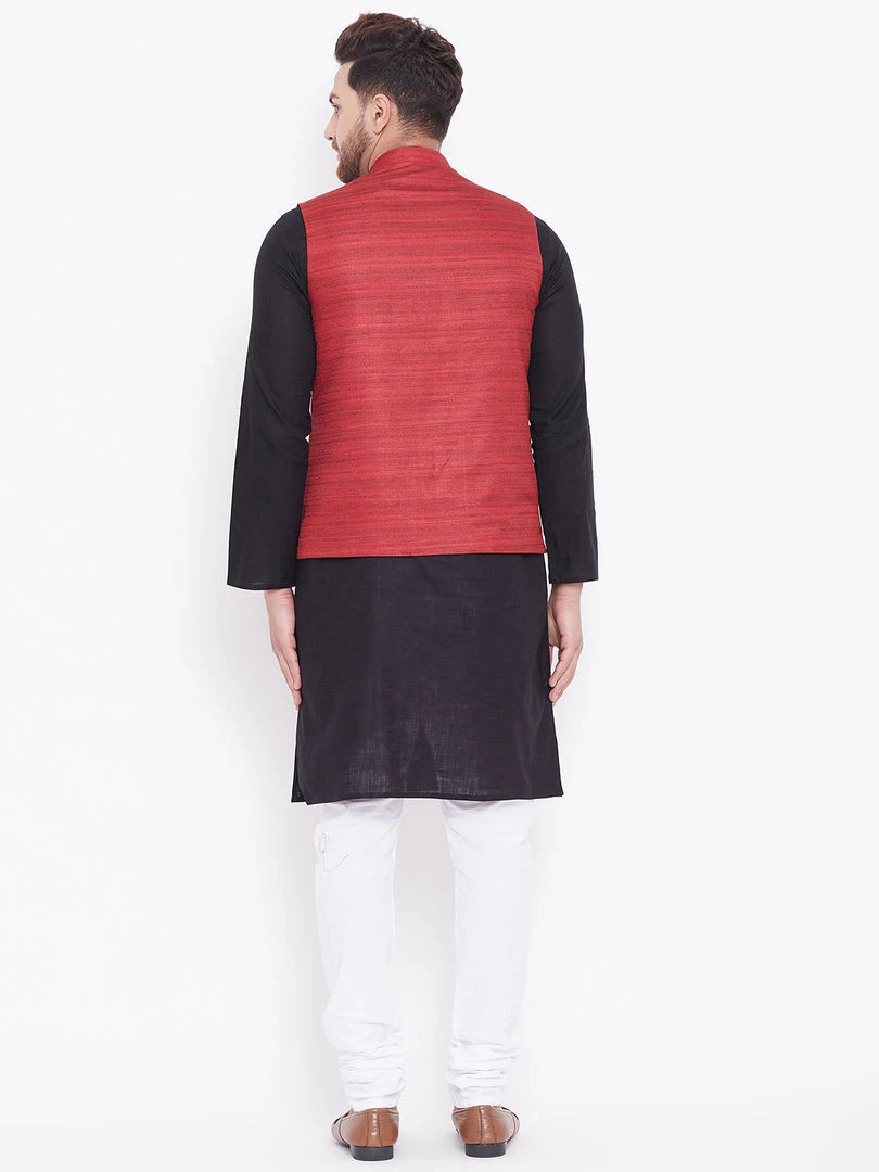Black solid kurta with solid churidar and maroon Nehru jacket