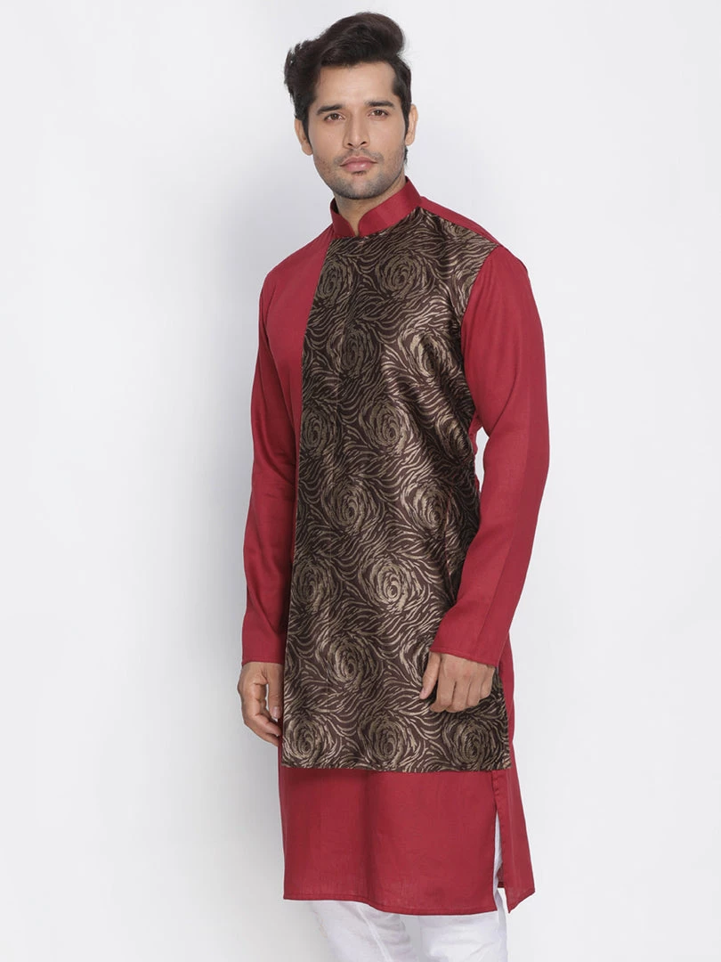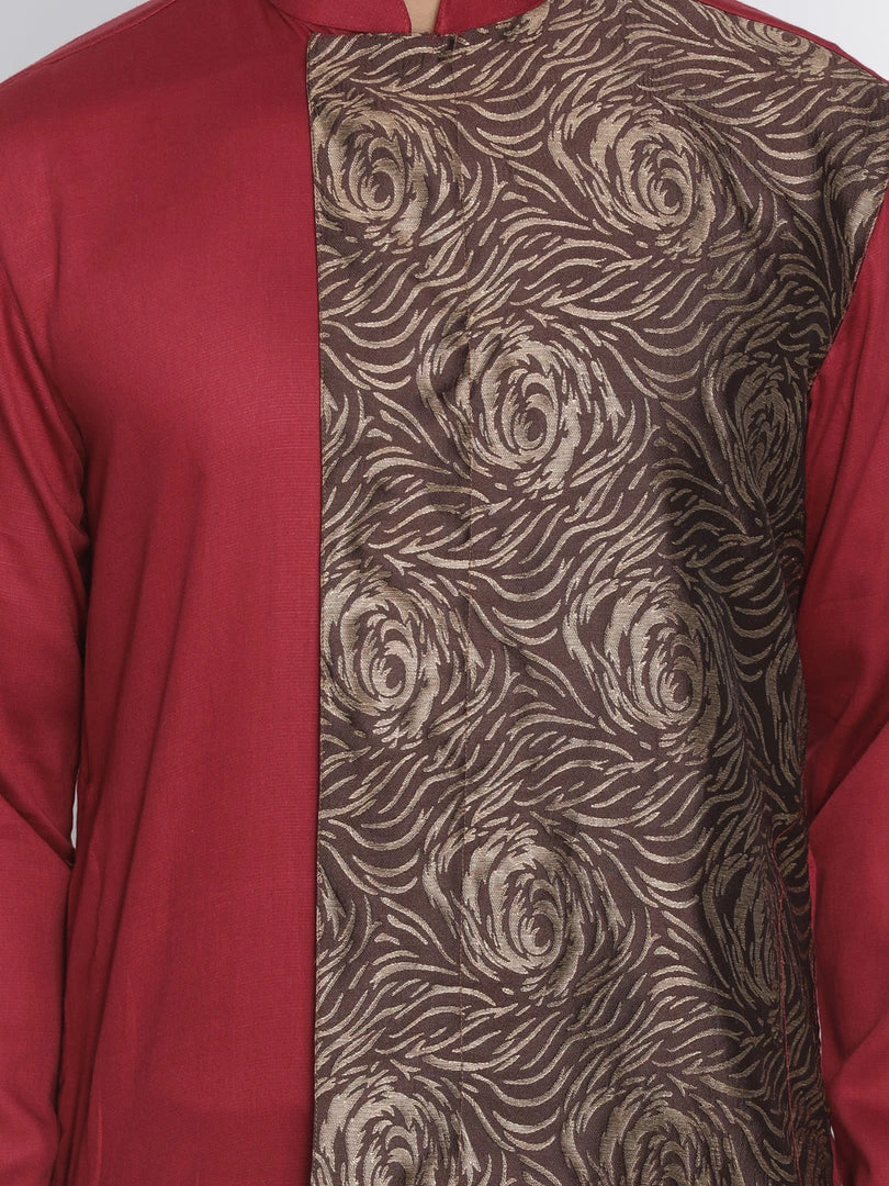 Maroon and golden half printed straight kurta, has a mandarin collar, long sleeves, straight hem, and side slits
