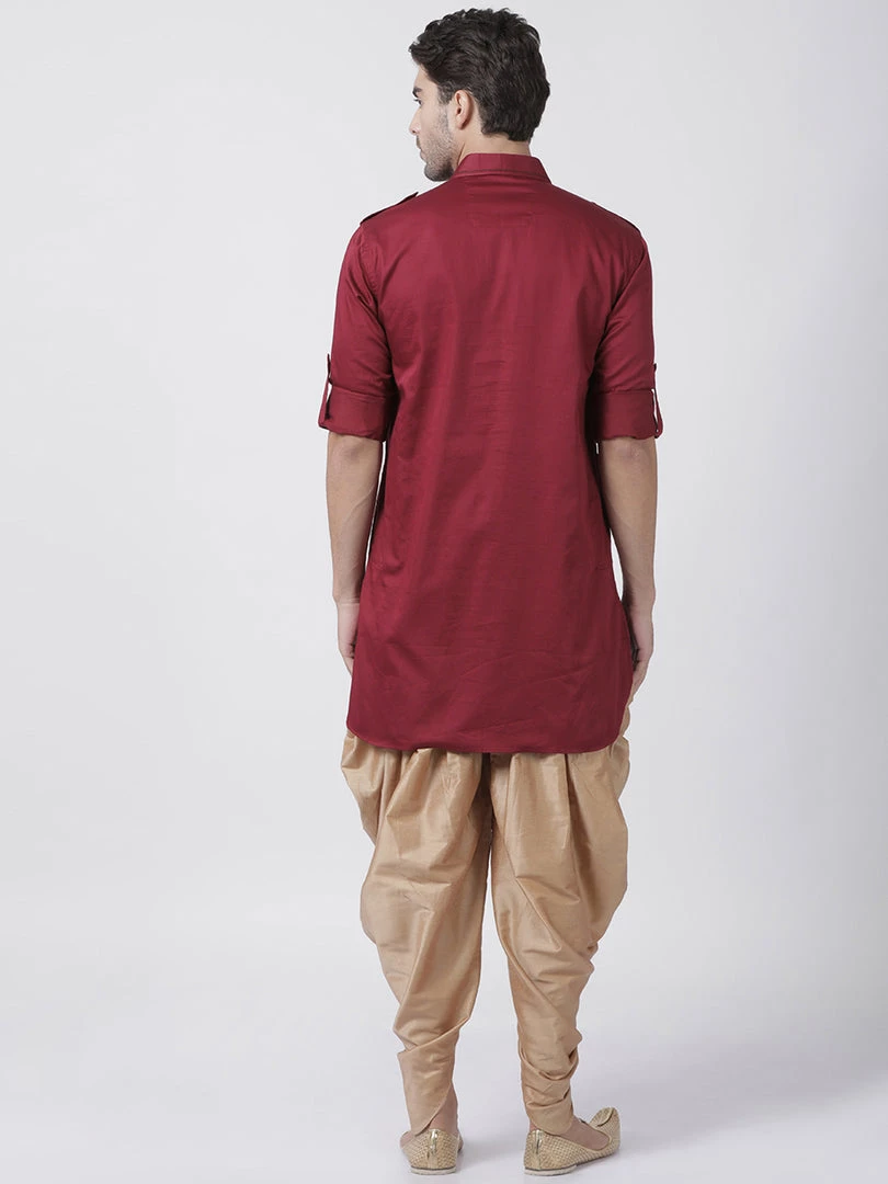 Maroon solid straight above knee length kurta, has a shirt collar, button placket, long sleeves, two pockets and curved hem