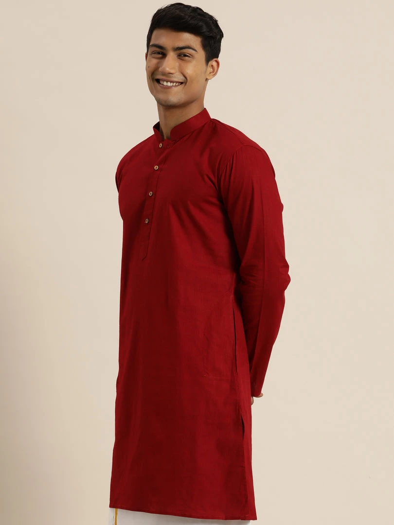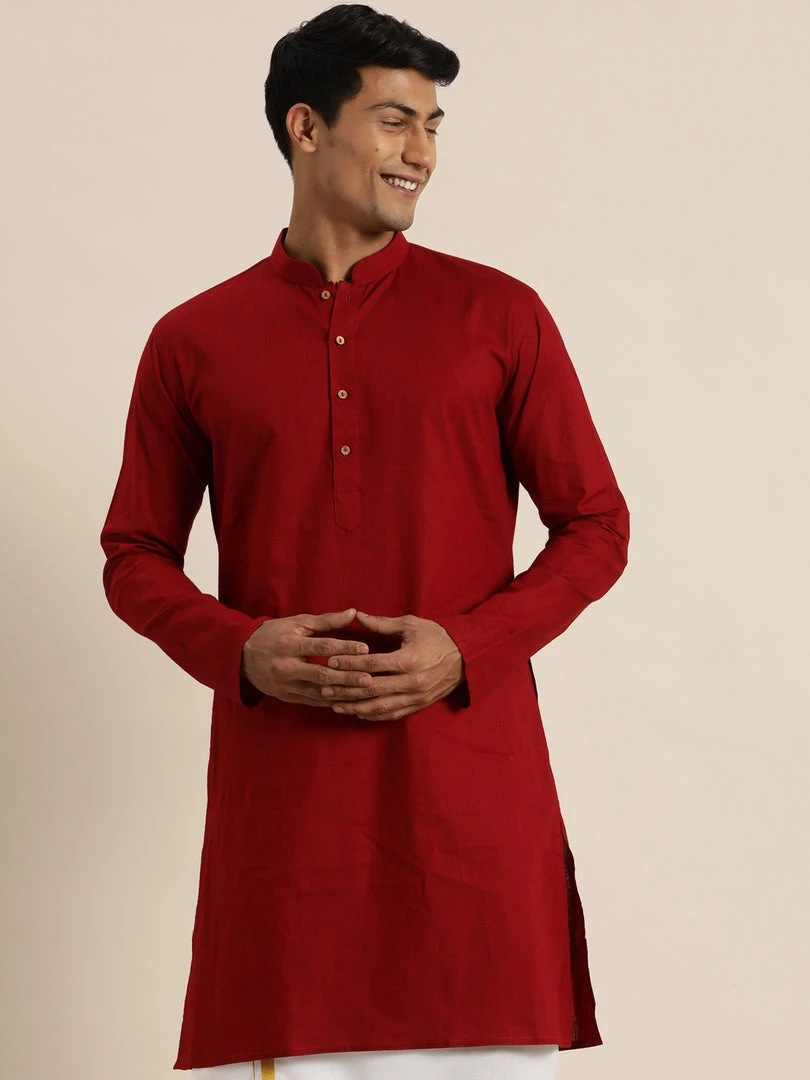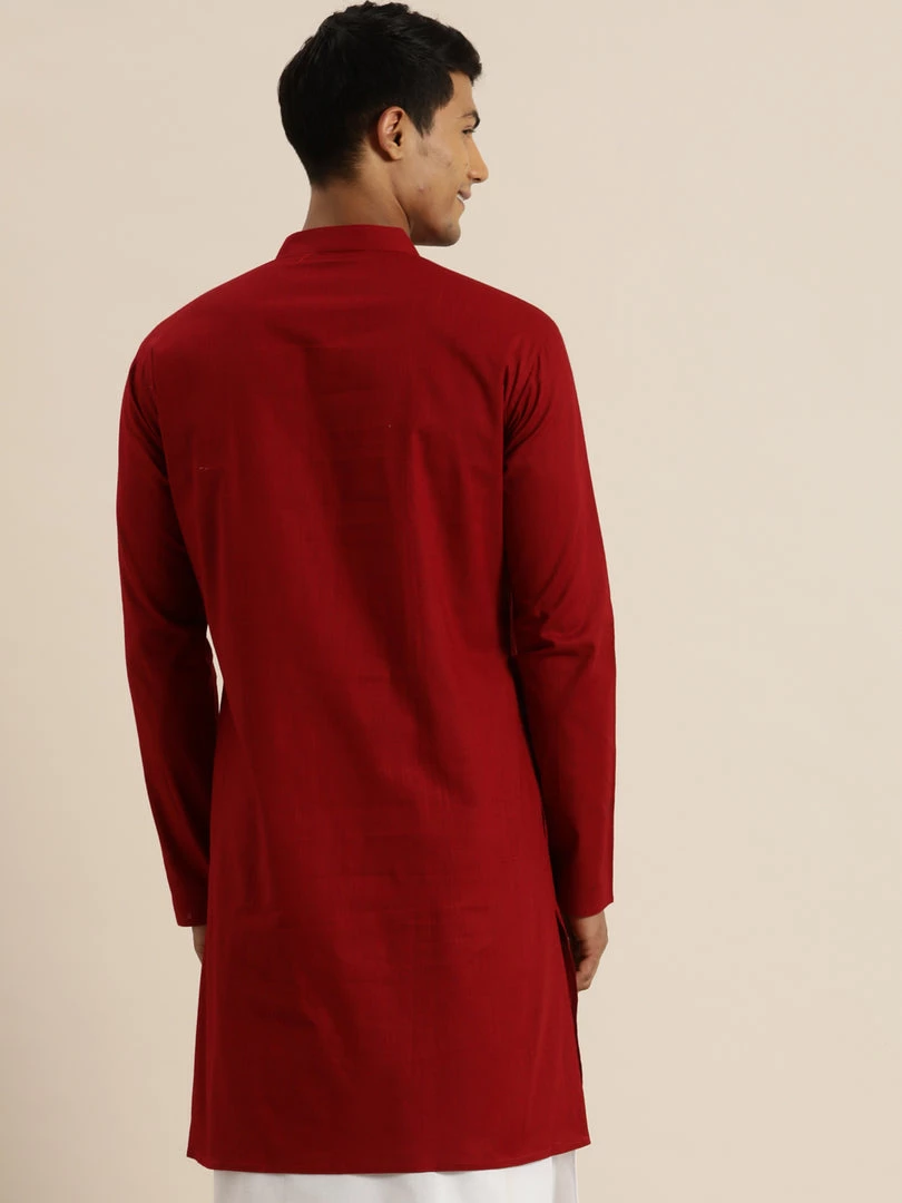 Maroon solid above knee length kurta, has a mandarin collar, button placket, long sleeves and side slits