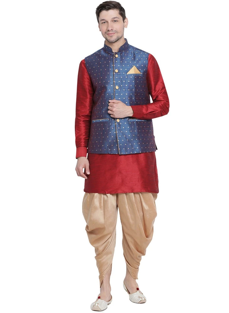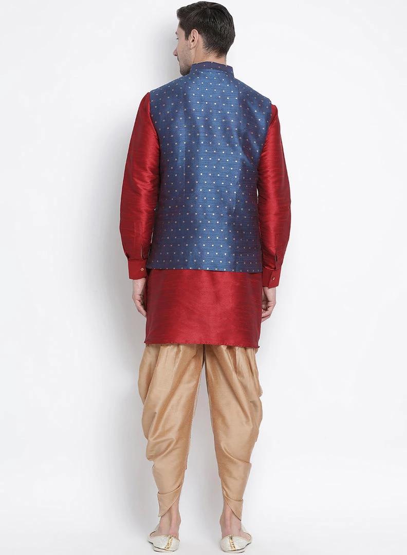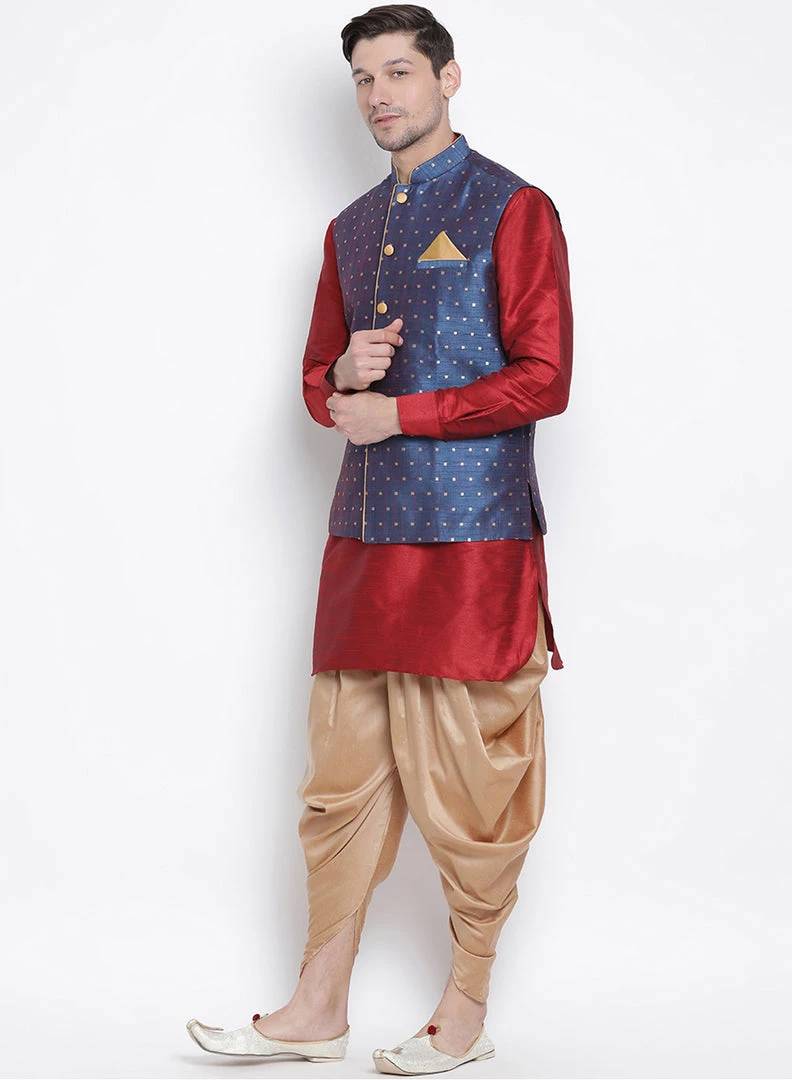 Maroon solid kurta with solid dhoti pant and blue Nehru jacket