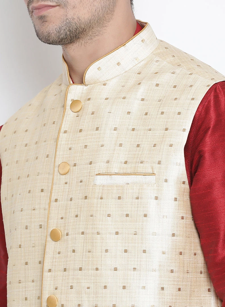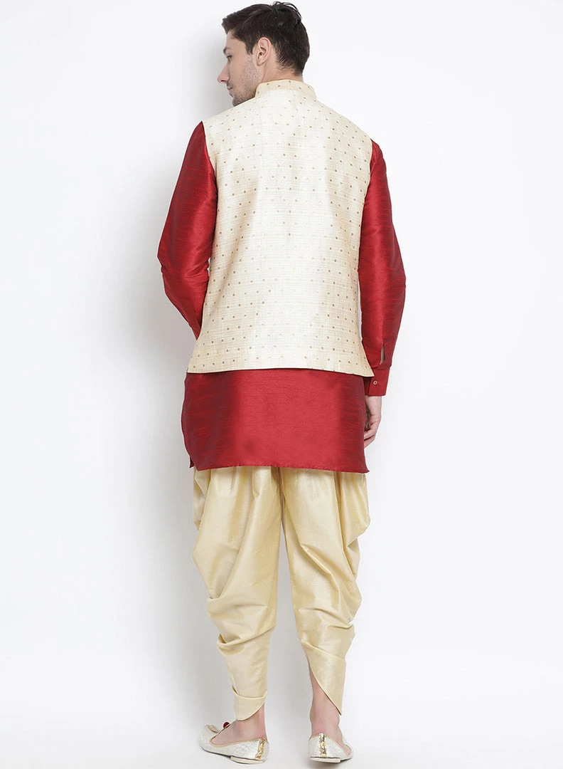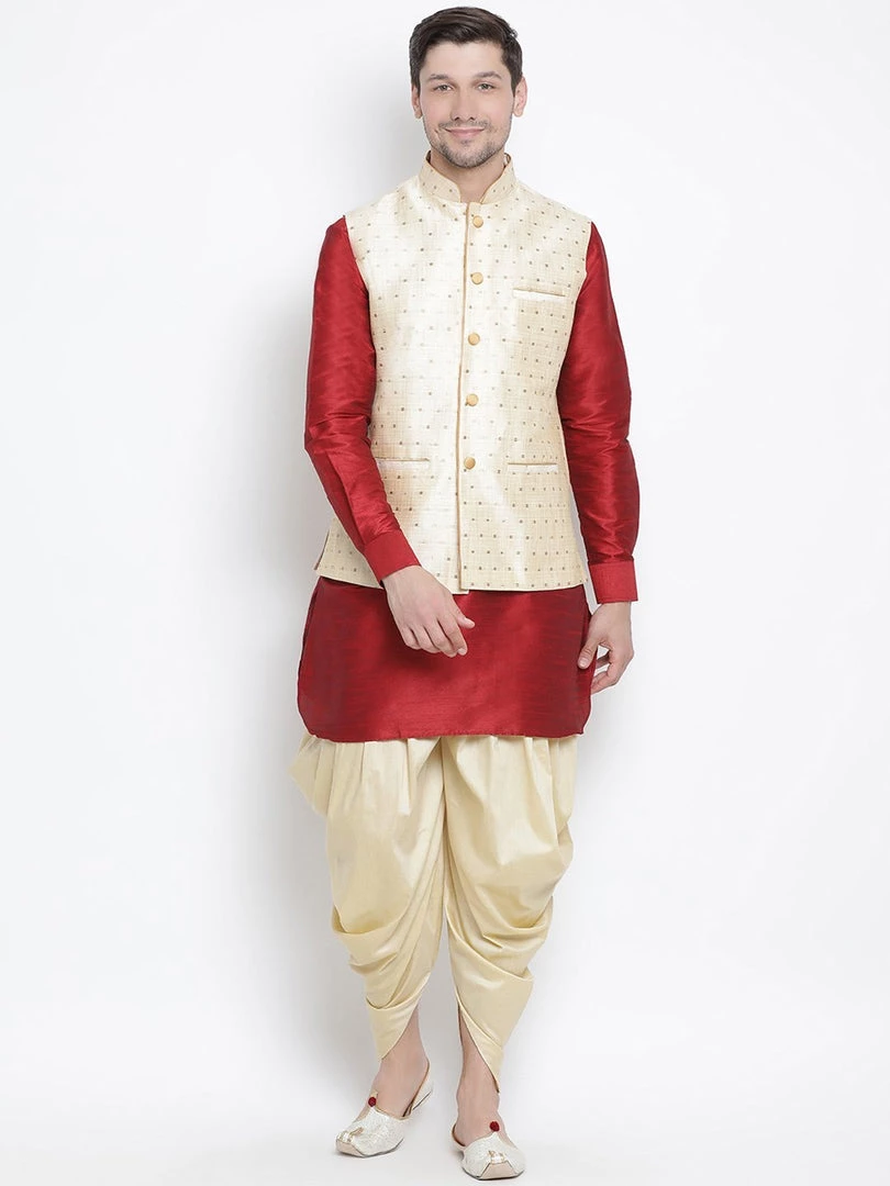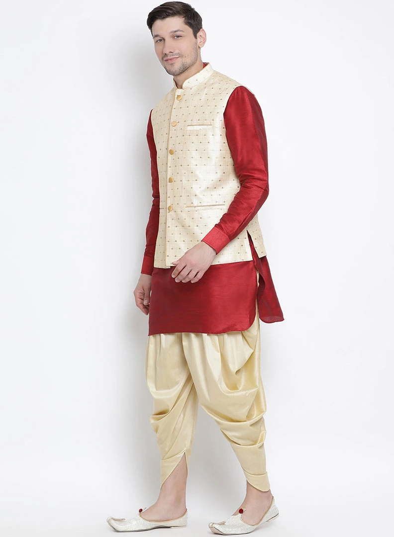 Maroon solid kurta with solid dhoti pant and golden Nehru jacket