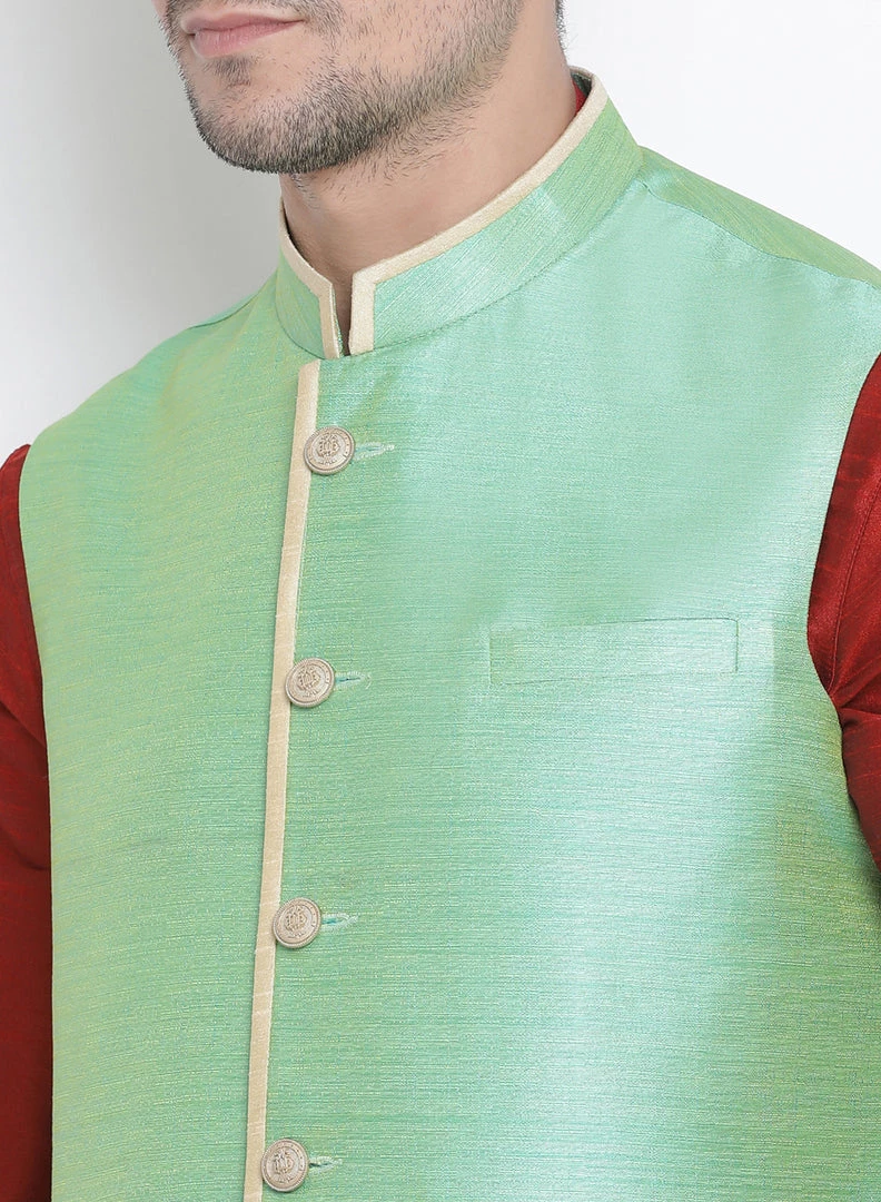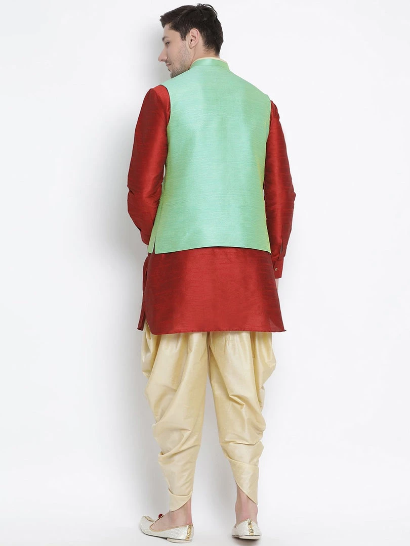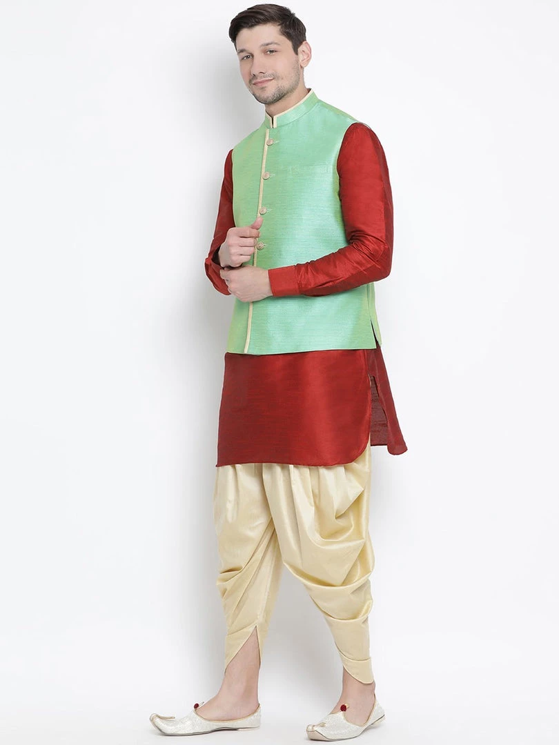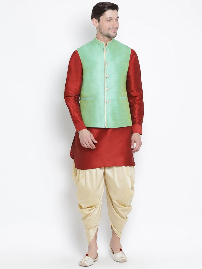 Maroon solid kurta with solid dhoti pant and green Nehru jacket