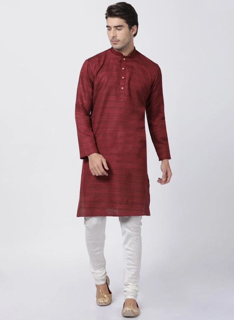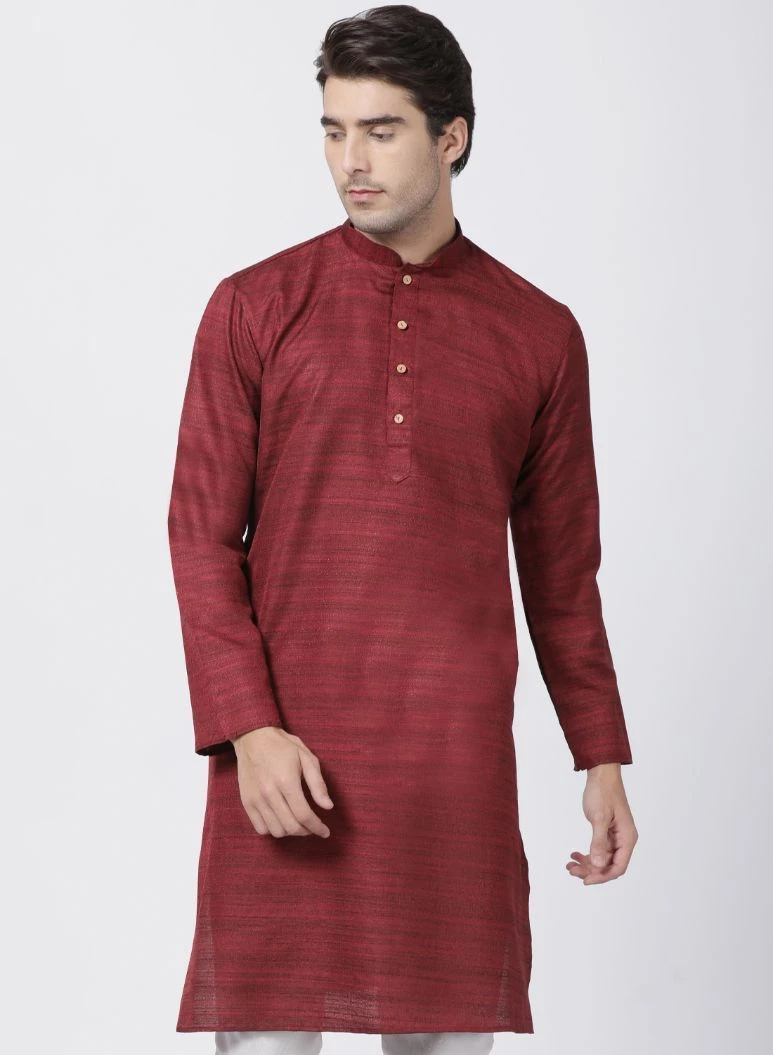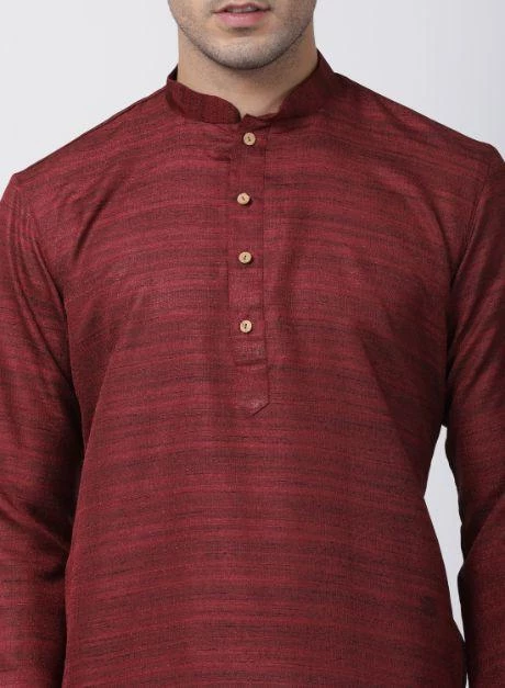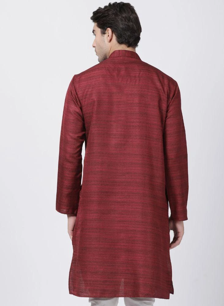 Maroon woven straight kurta, has a mandarin collar, long sleeves, button placket, straight hem, and side slits