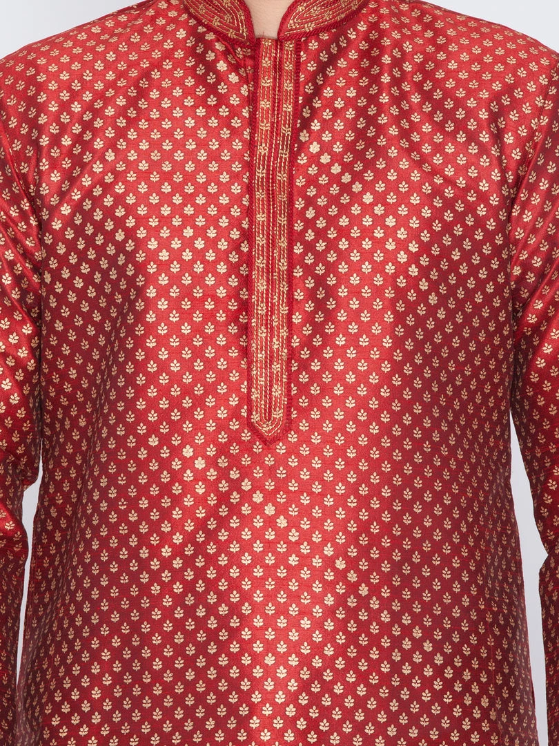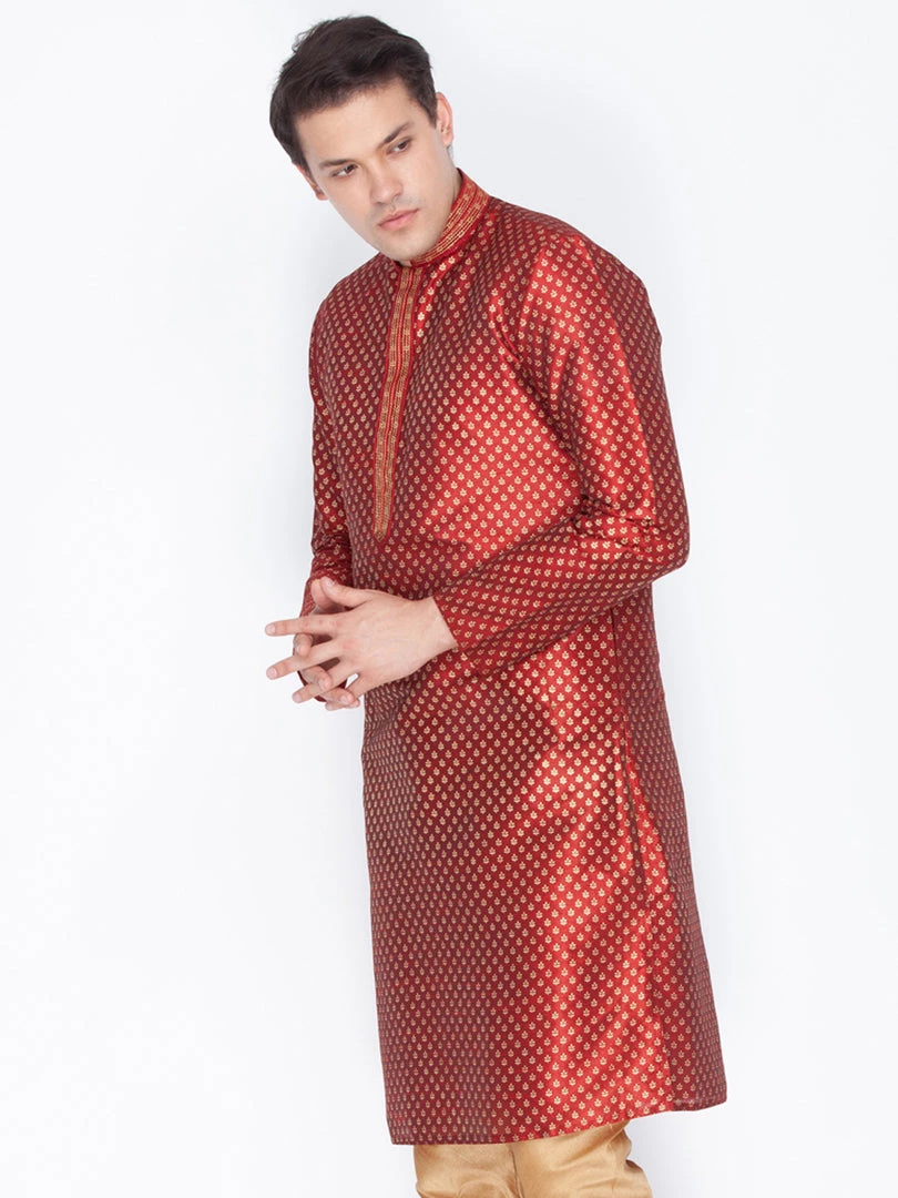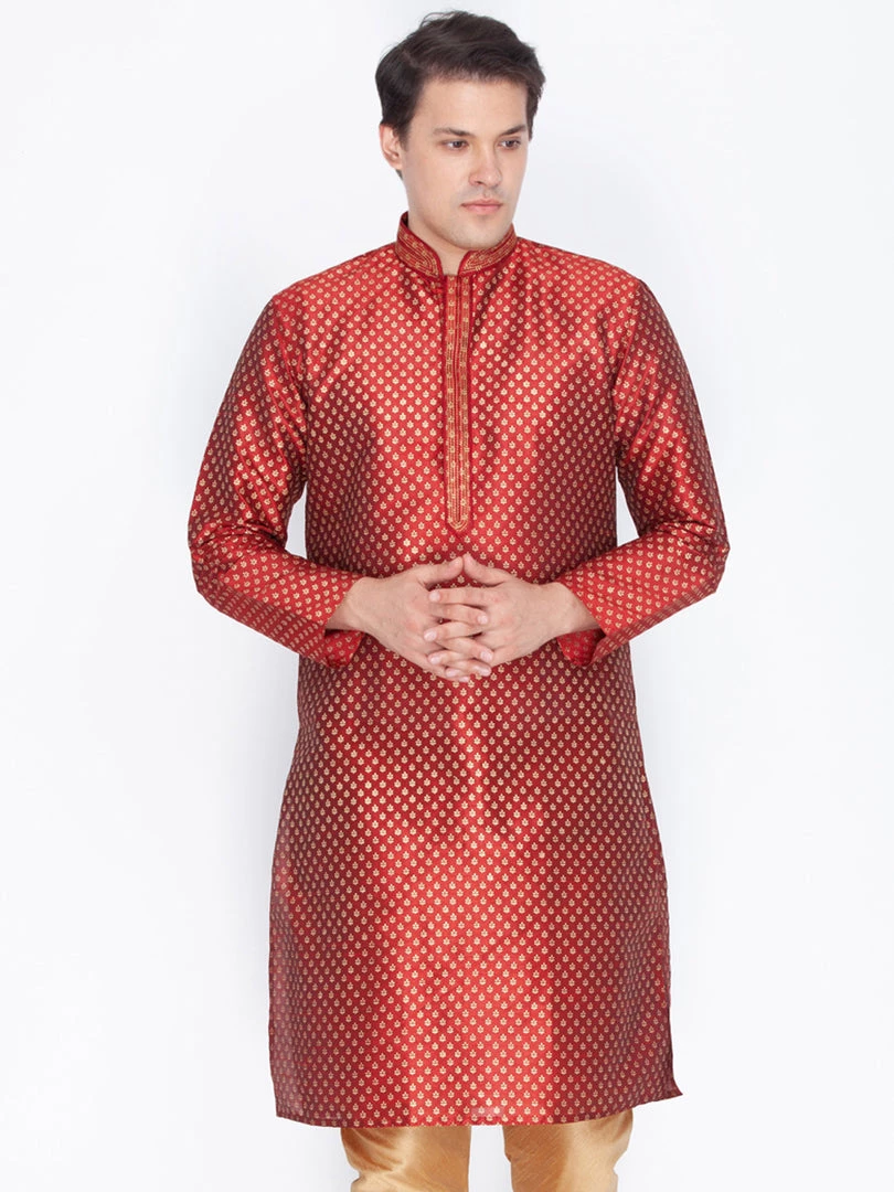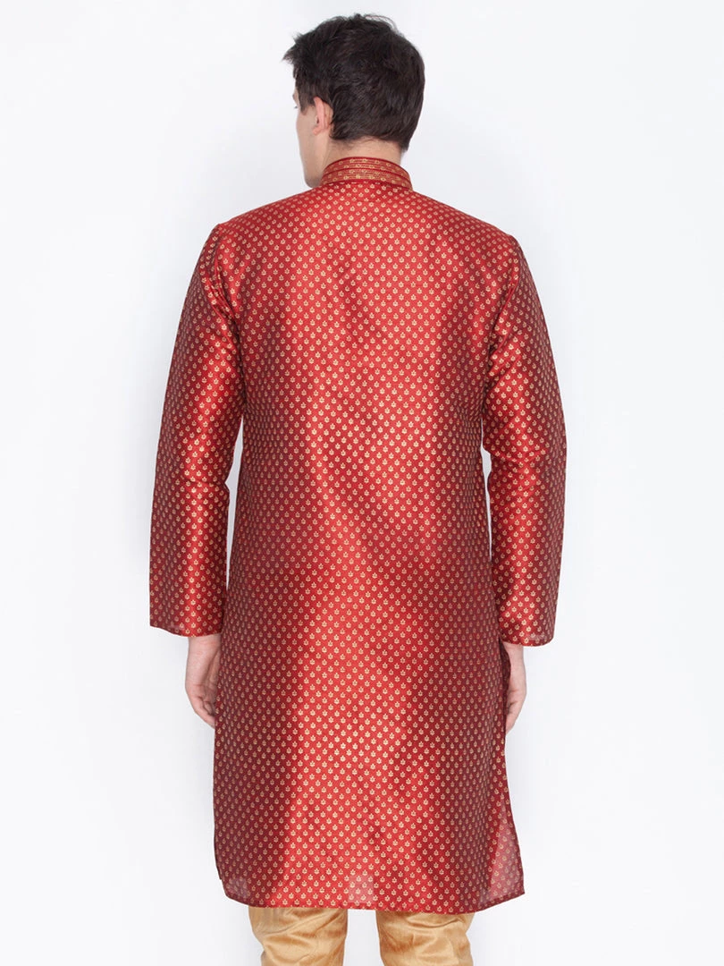 Maroon and golden printed straight kurta, has a mandarin collar, long sleeves, straight hem, and side slits