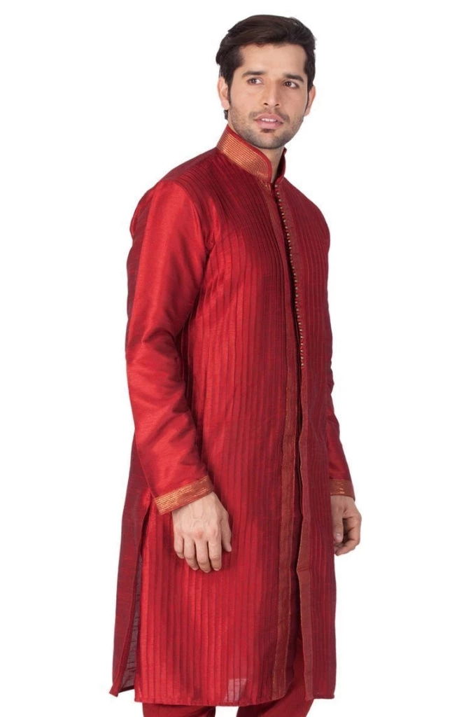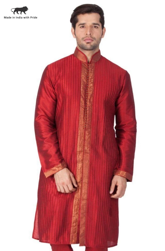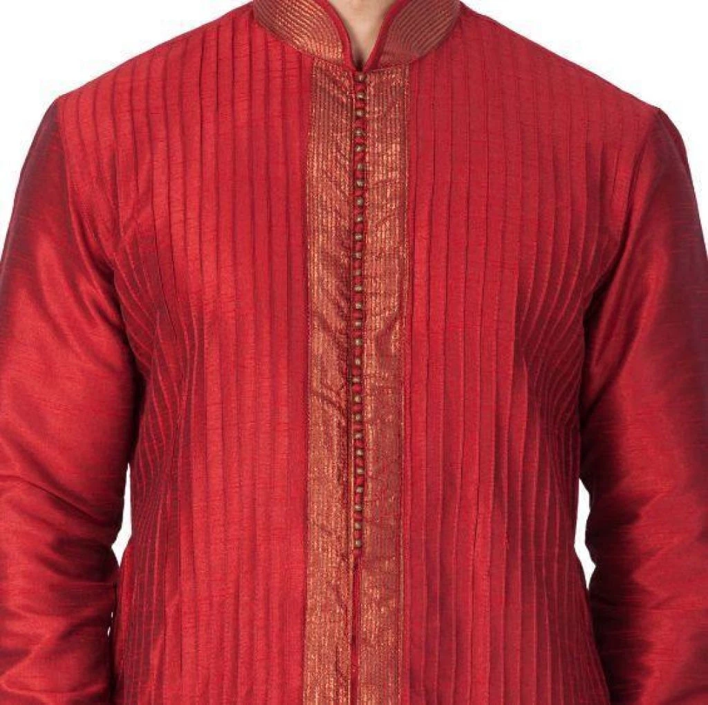 Maroon and gold pin tuck straight kurta, has a mandarin collar, long sleeves, button placket, straight hem, and side slits