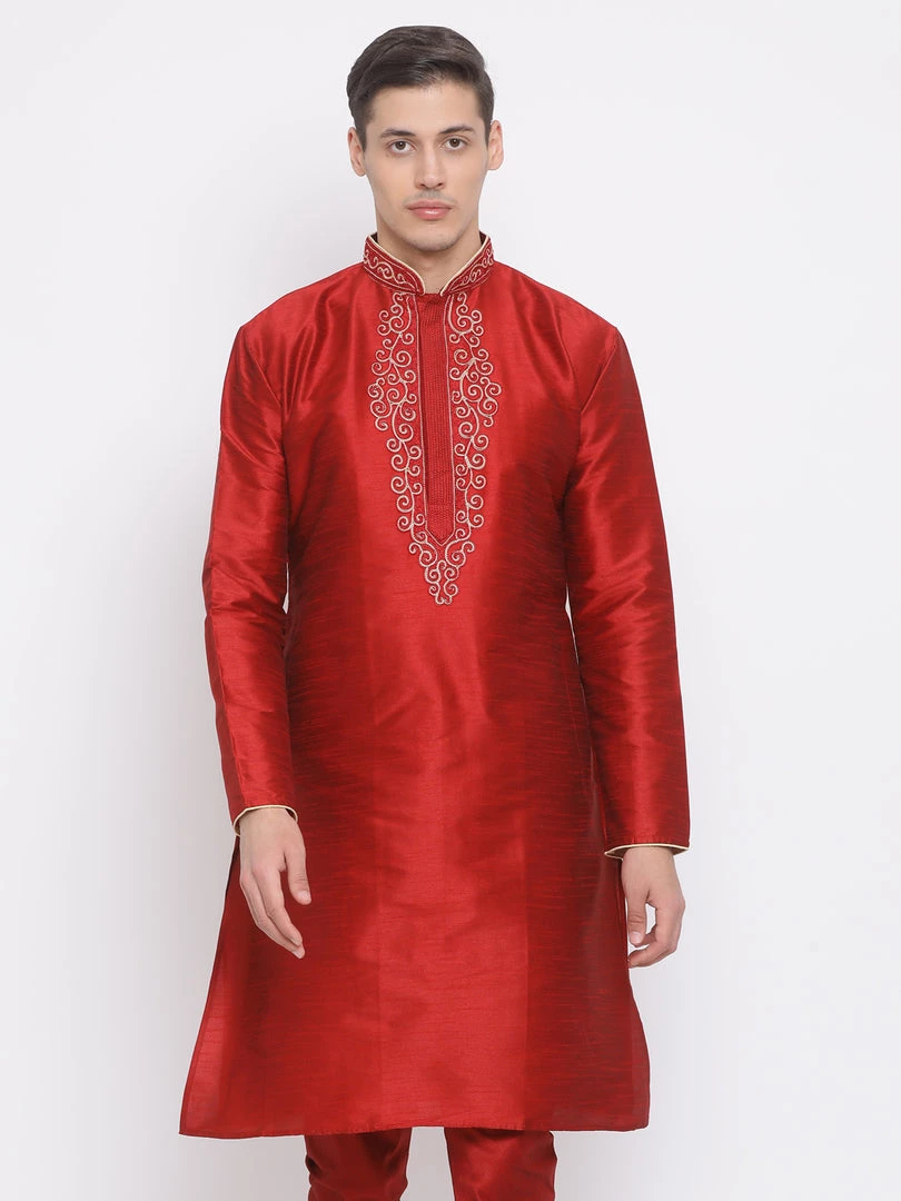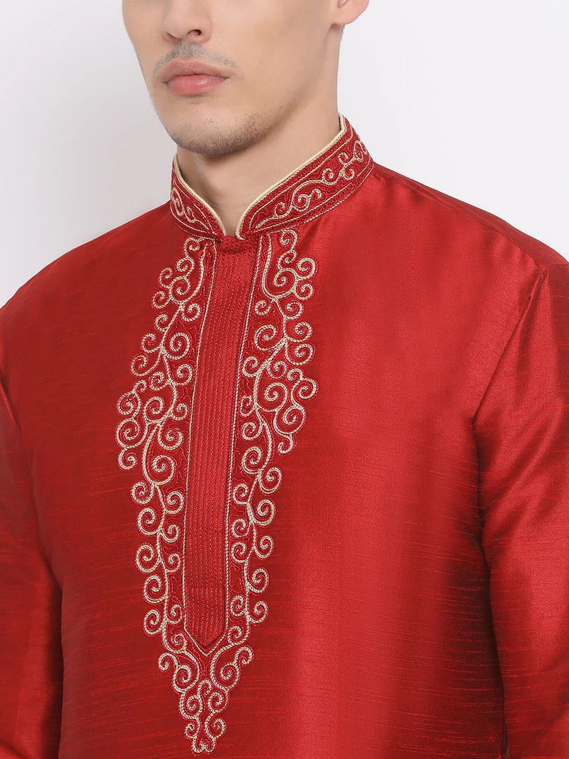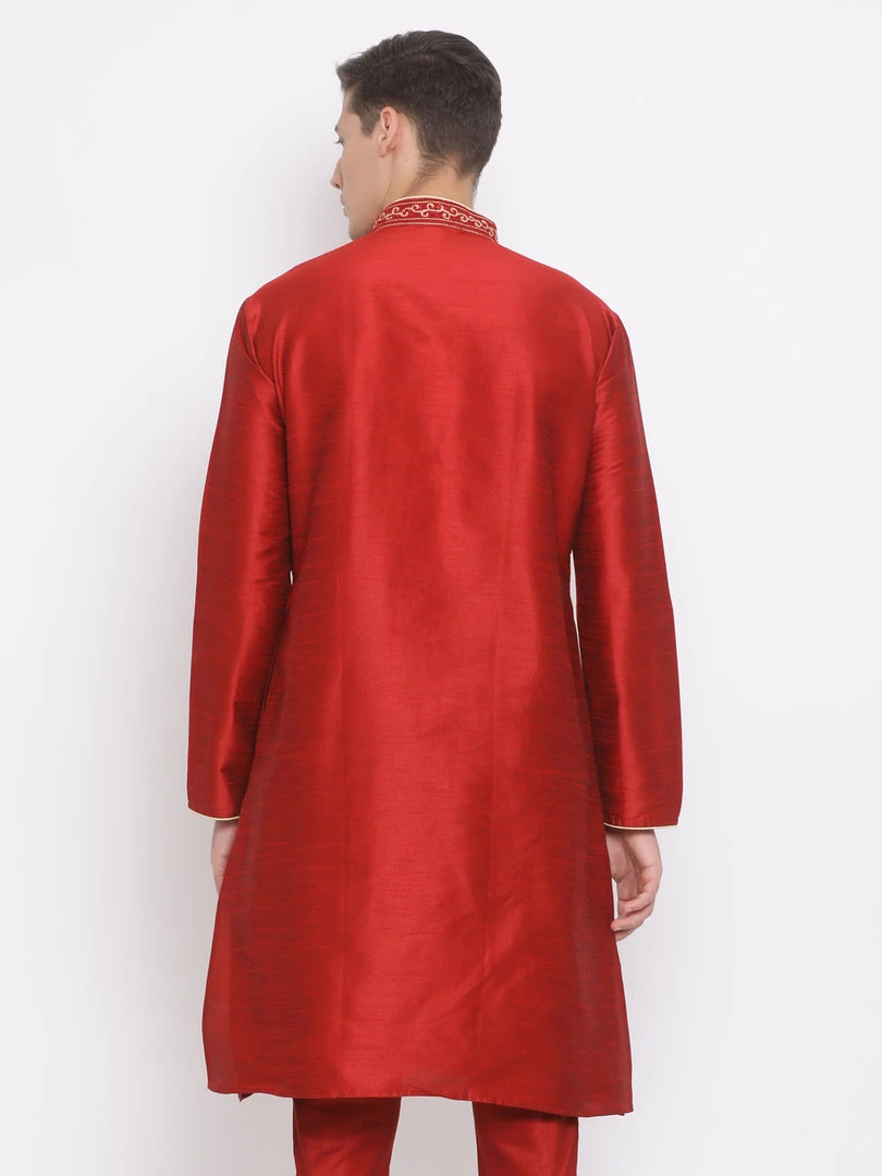 Maroon solid straight kurta, has a mandarin collar, long sleeves, straight hem, golden detailing around collar and placket and side slits