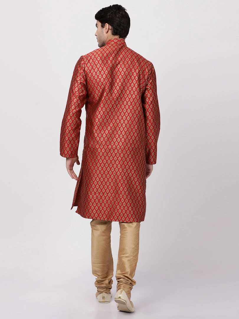 Gold-toned and maroon straight woven knee-length kurta, has a turtle neck, button detailing, long sleeves, straight hem