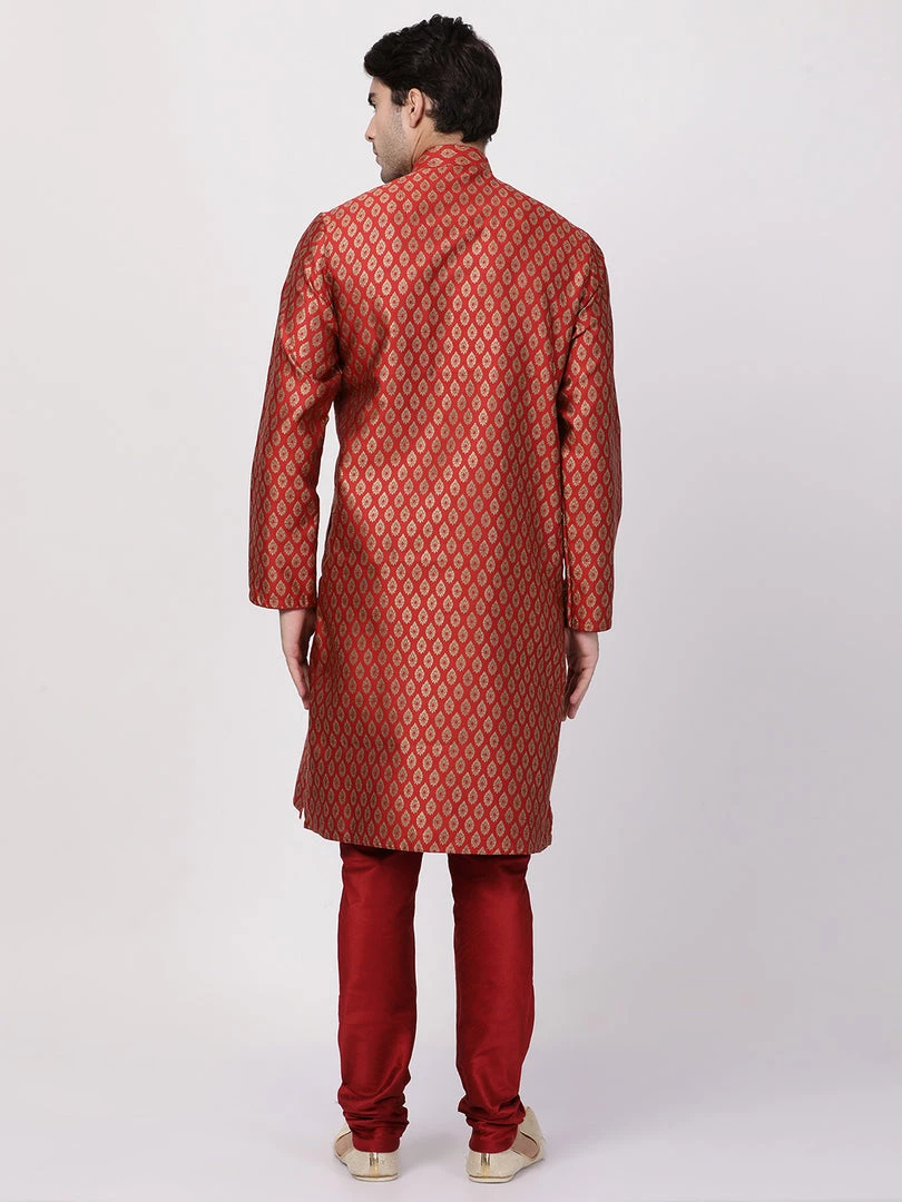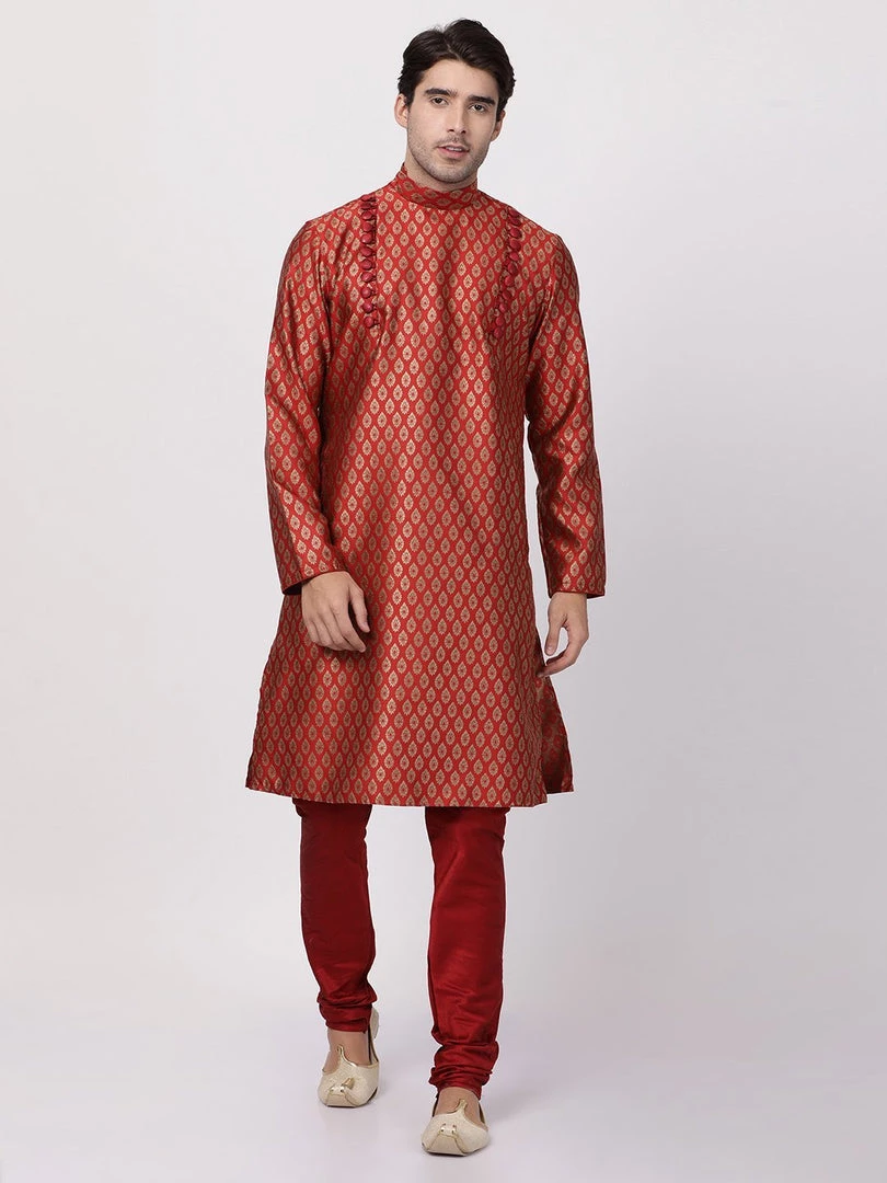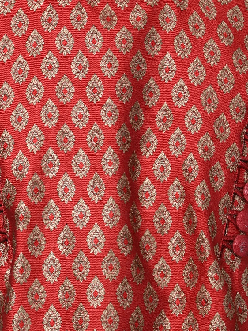 Gold-toned and maroon woven kurta with churidar.