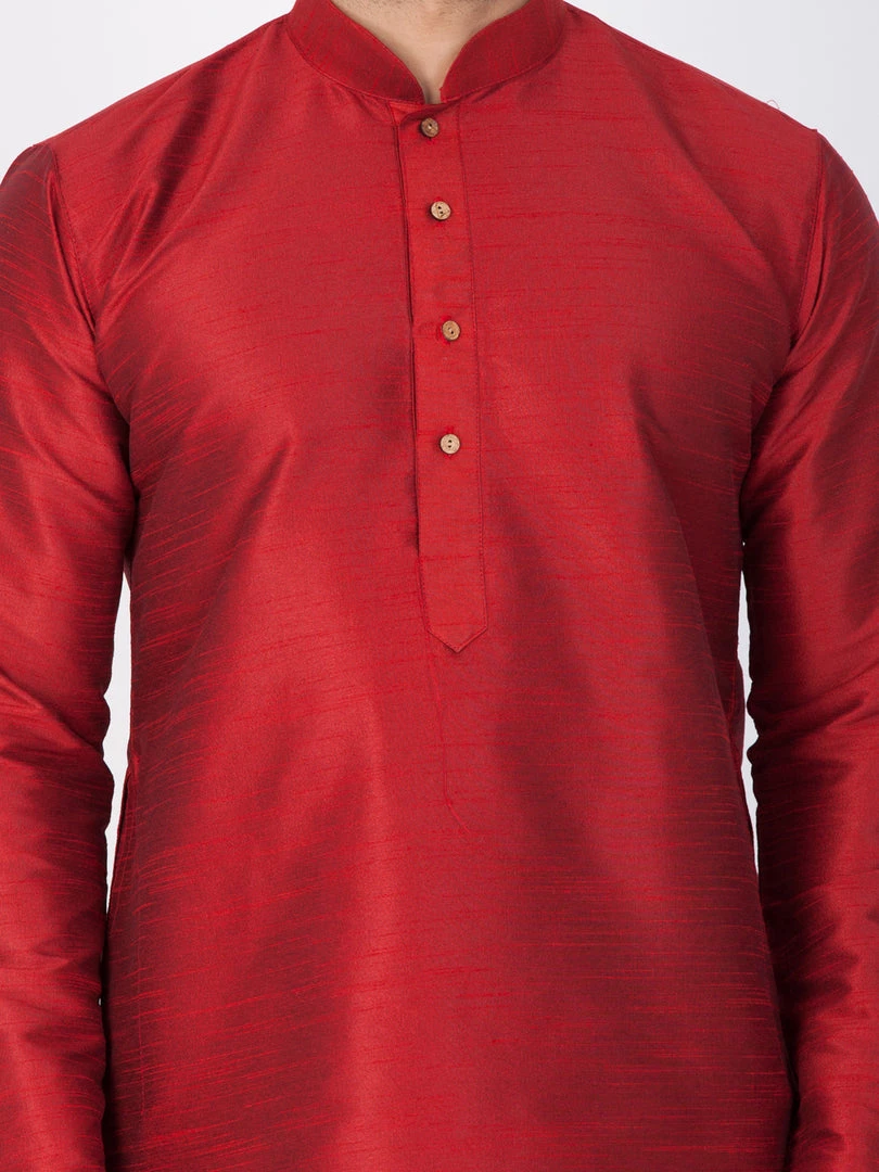 Maroon solid straight knee length kurta, has a mandarin collar, long sleeves, button placket, straight hem