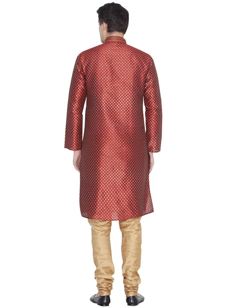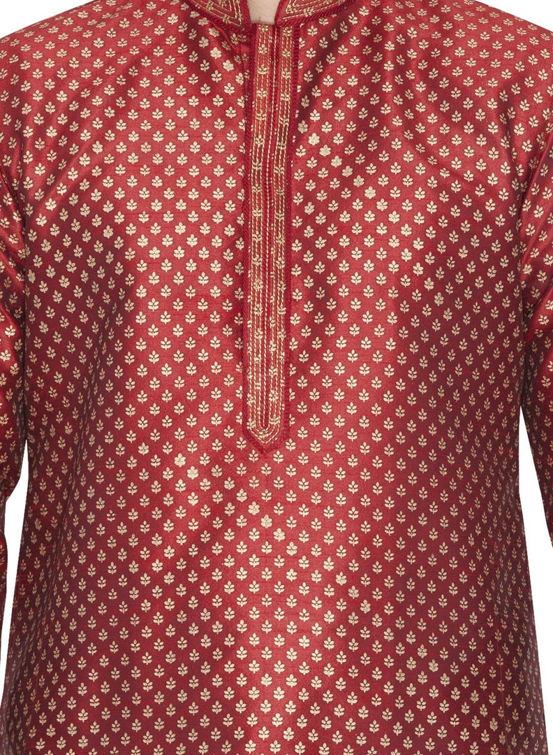 Maroon and golden printed straight knee length kurta, has a mandarin collar, long sleeves, straight hem