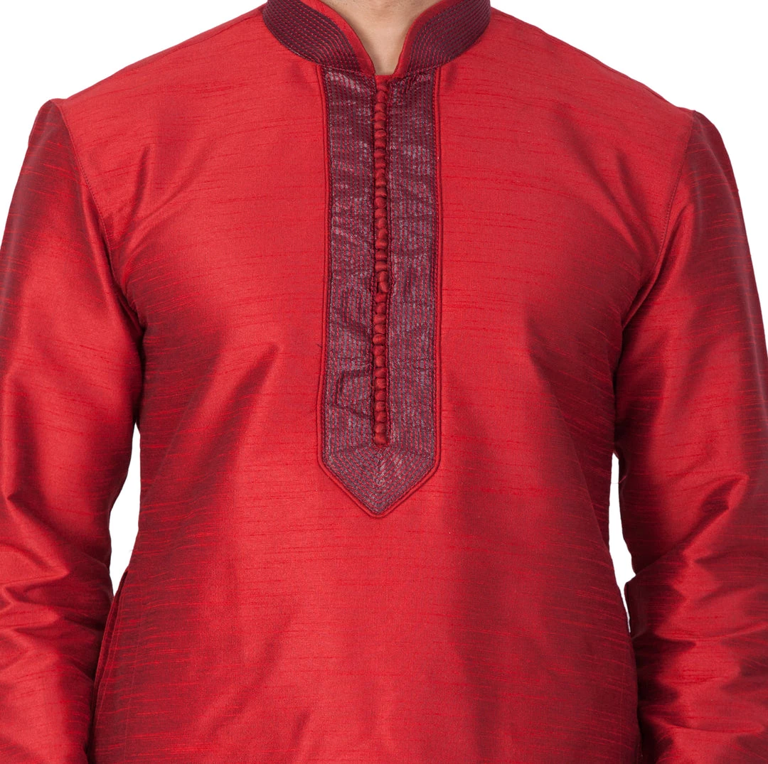 Maroon solid straight knee length kurta, has a mandarin collar, embroidered details on collar, long sleeves, button placket, straight hem