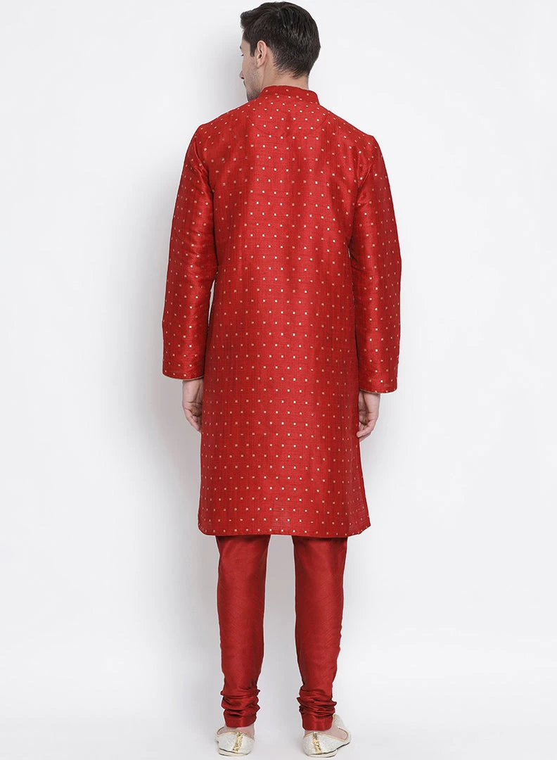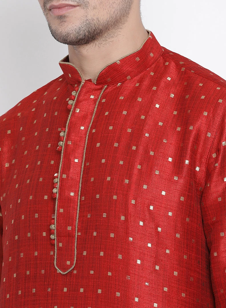 Maroon and golden woven straight knee length kurta, has a mandarin collar, long sleeves, button placket, straight hem