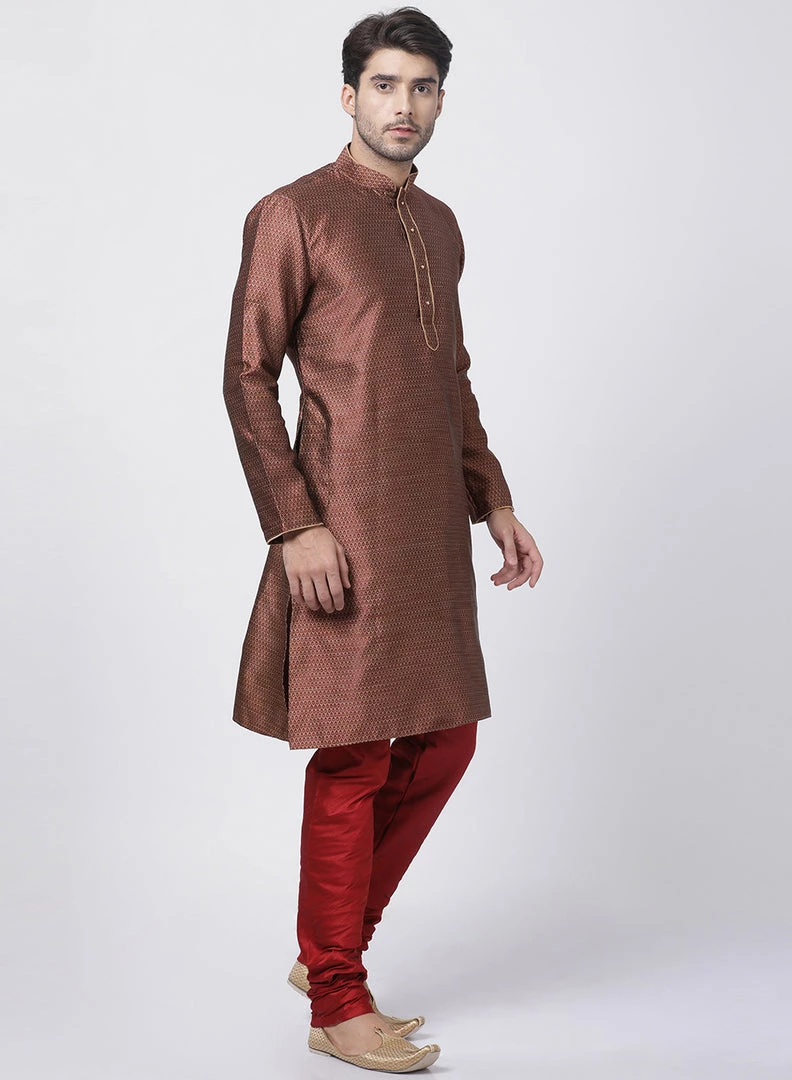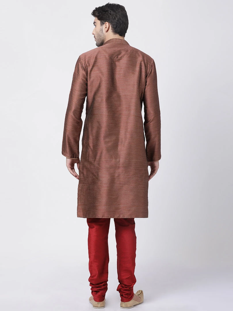 Maroon and beige woven straight knee length kurta, has a mandarin collar, button placket, long sleeves, straight hem