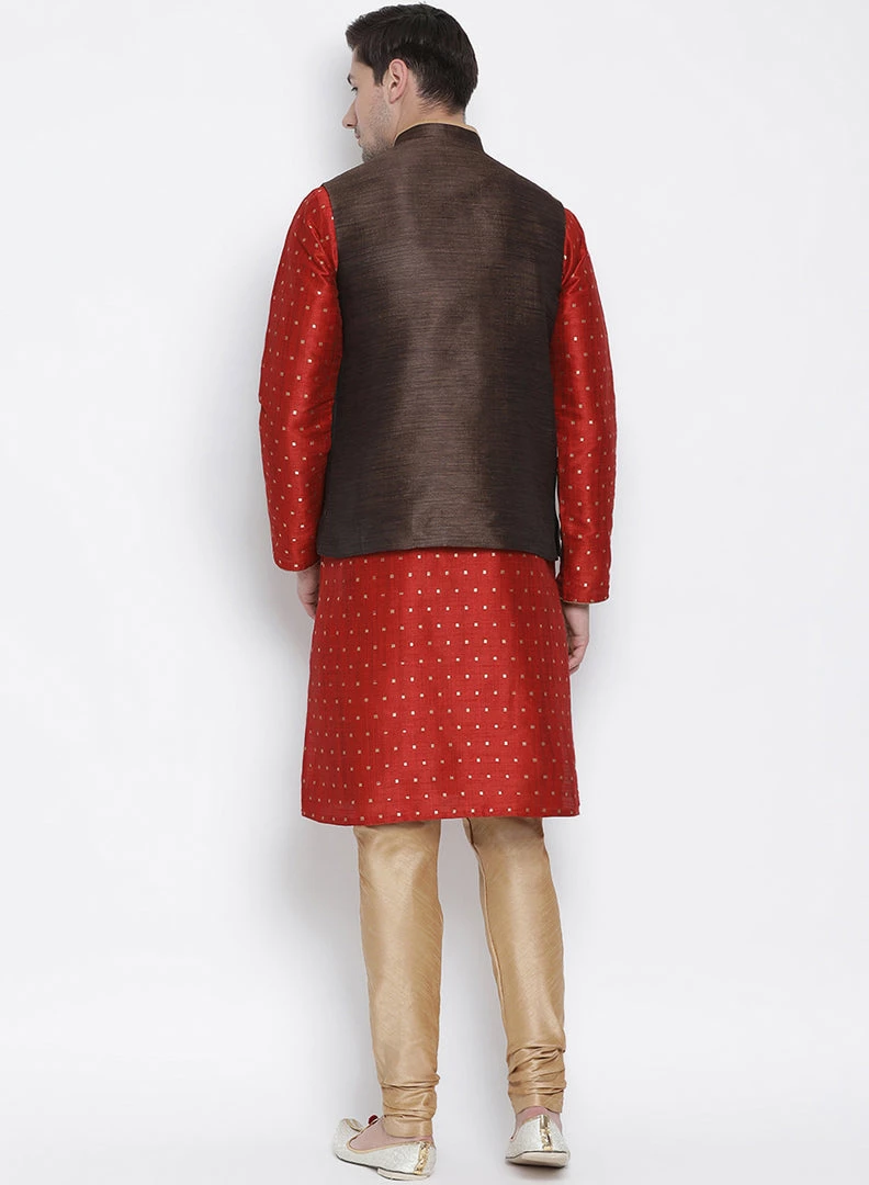 Maroon and gold self-design woven kurta with solid churidar and brown Nehru jacket