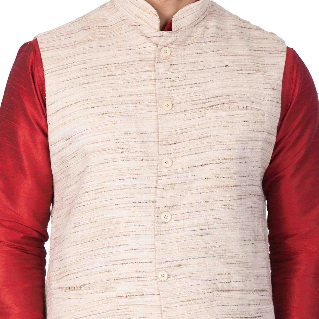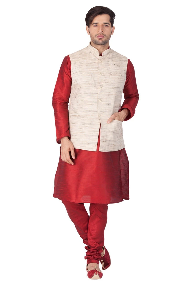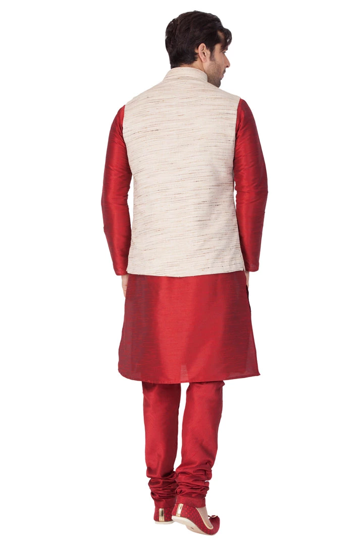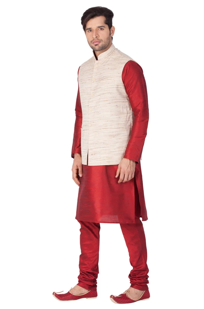 Maroon solid kurta with solid churidar and beige Nehru jacket