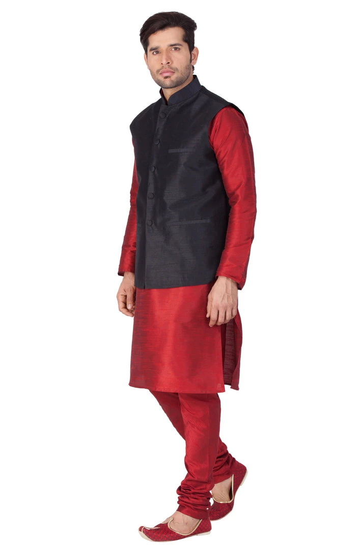 Maroon solid kurta with solid churidar and black Nehru jacket