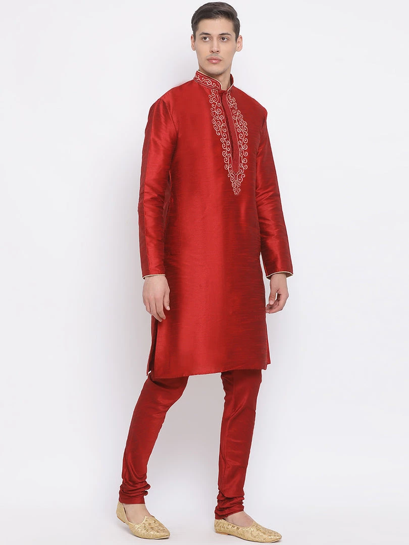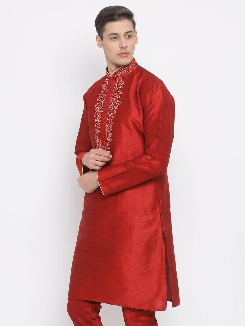 Maroon solid straight kurta, has a mandarin collar, long sleeves, straight hem, golden detailing around collar and placket and side slits
