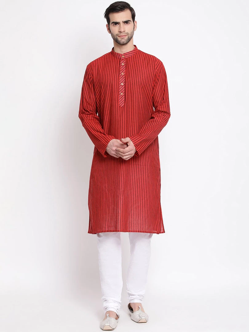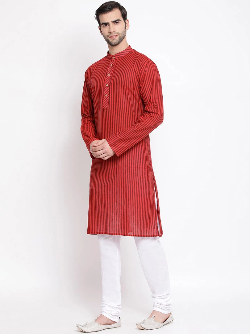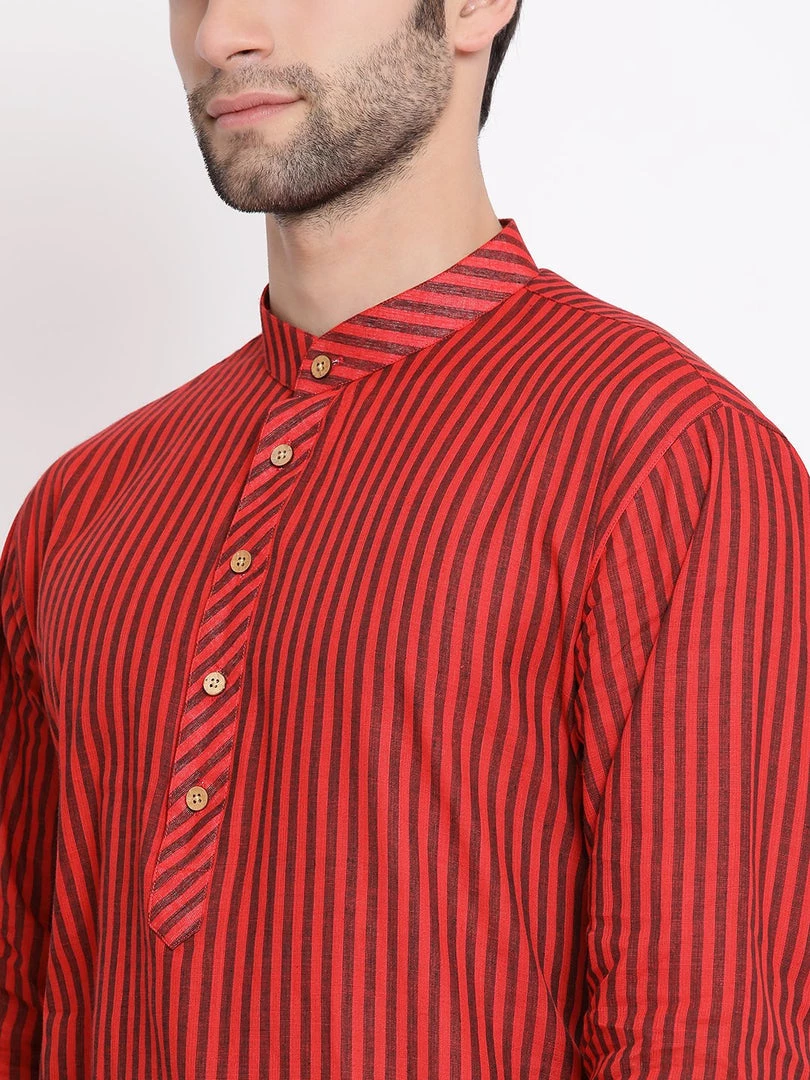 Maroon and dark brown stripe woven straight knee length kurta, has a mandarin collar, long sleeves, button placket, straight hem.