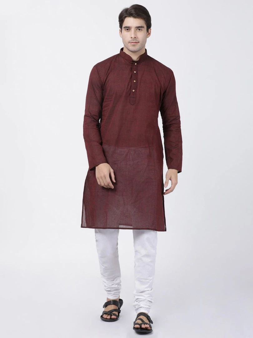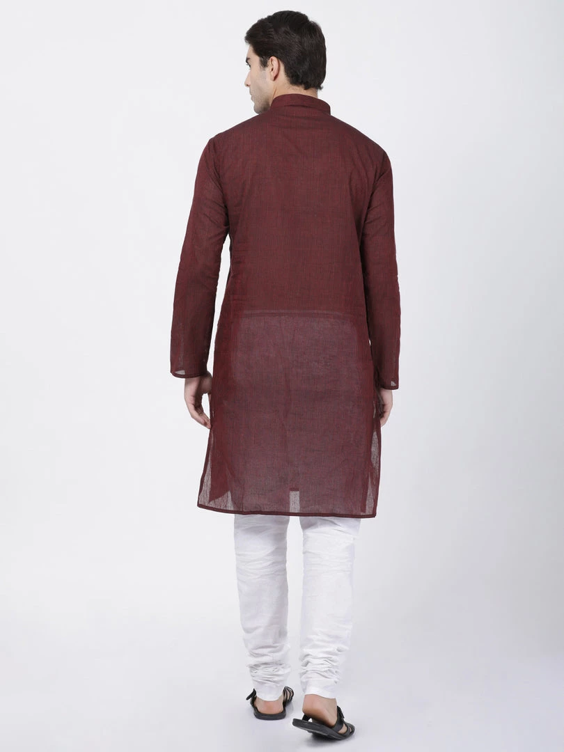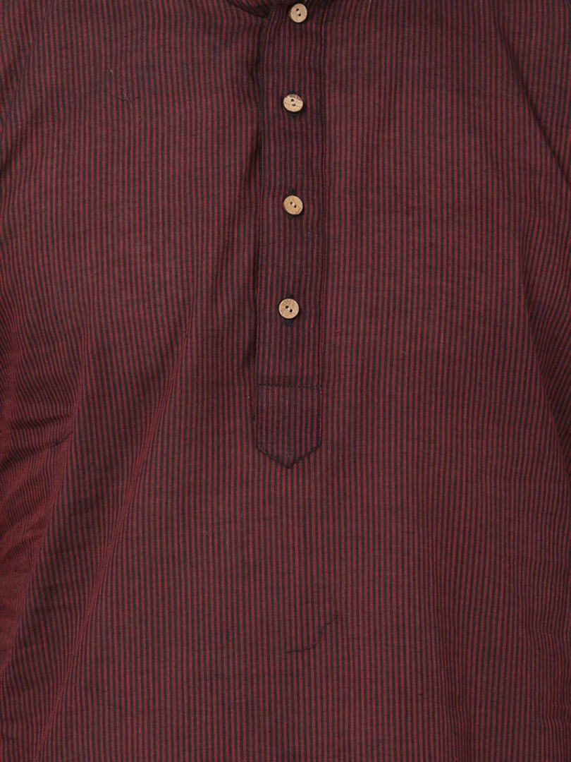 Maroon and black stripe woven straight knee length kurta, has a mandarin collar, button placket, long sleeves, straight hem.