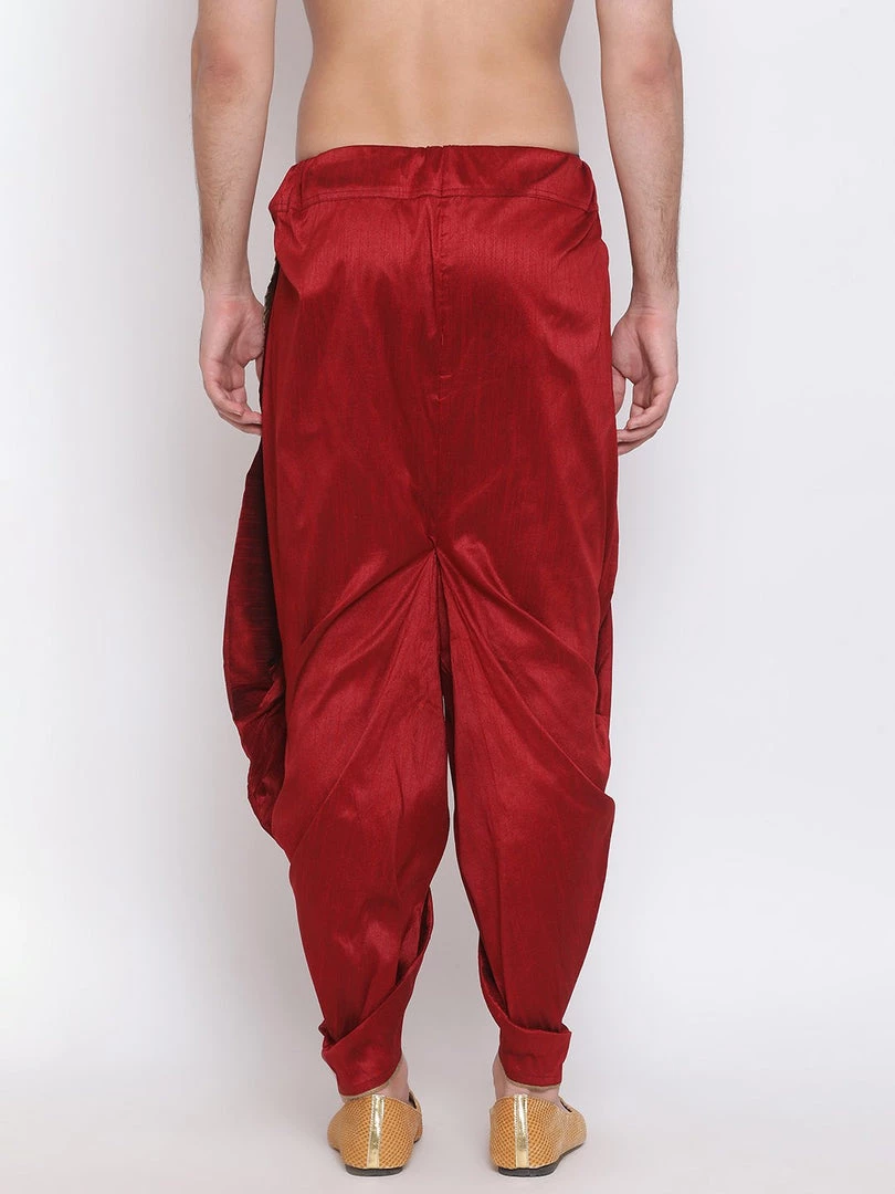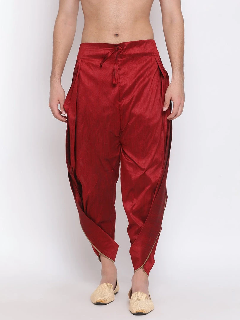 Maroon solid ready to wear mid-rise dhoti pant with gold-coloured border, has a waistband with a drawstring fastening and pleats on side