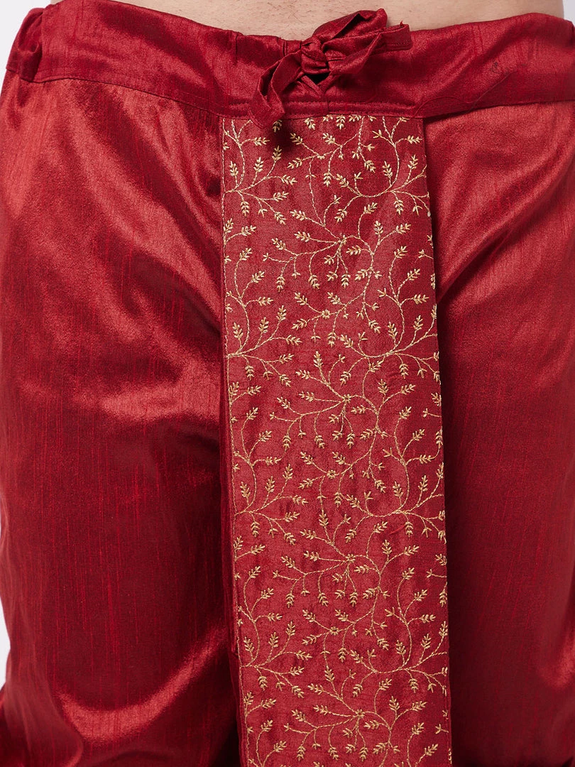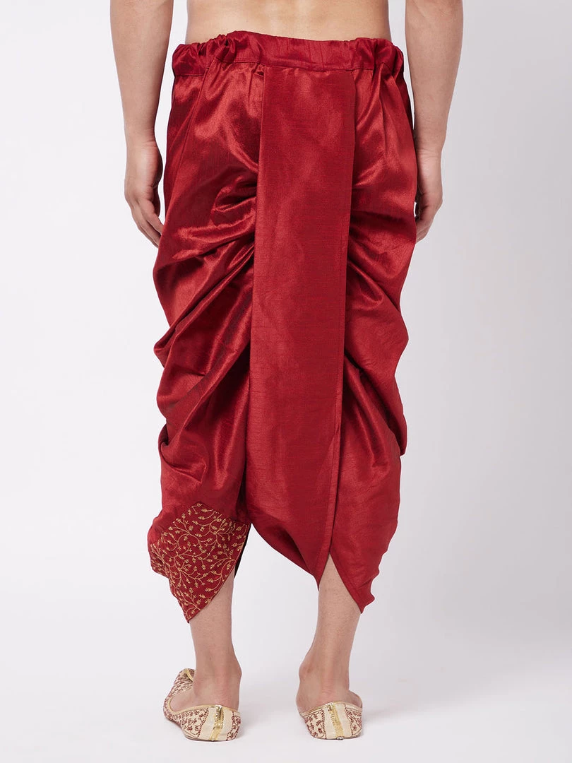 Maroon solid mid-rise ready-to-wear dhoti in a traditional pattern and golden embroidered detailing has a waistband with drawstring closure.