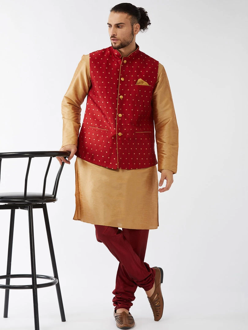 Gold-toned Solid kurta with Maroon solid Pyjama and Maroon woven Nehru jacket