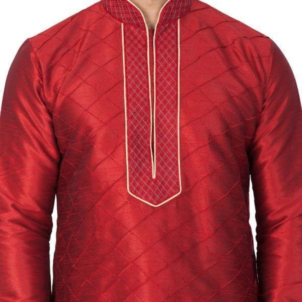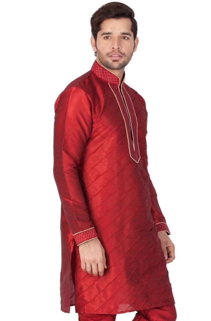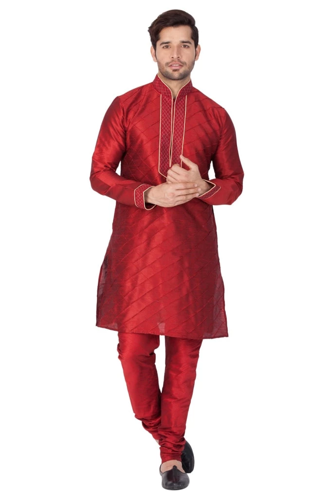 Maroon pin tuck straight kurta, has a mandarin collar, long sleeves, button placket, straight hem, and side slits