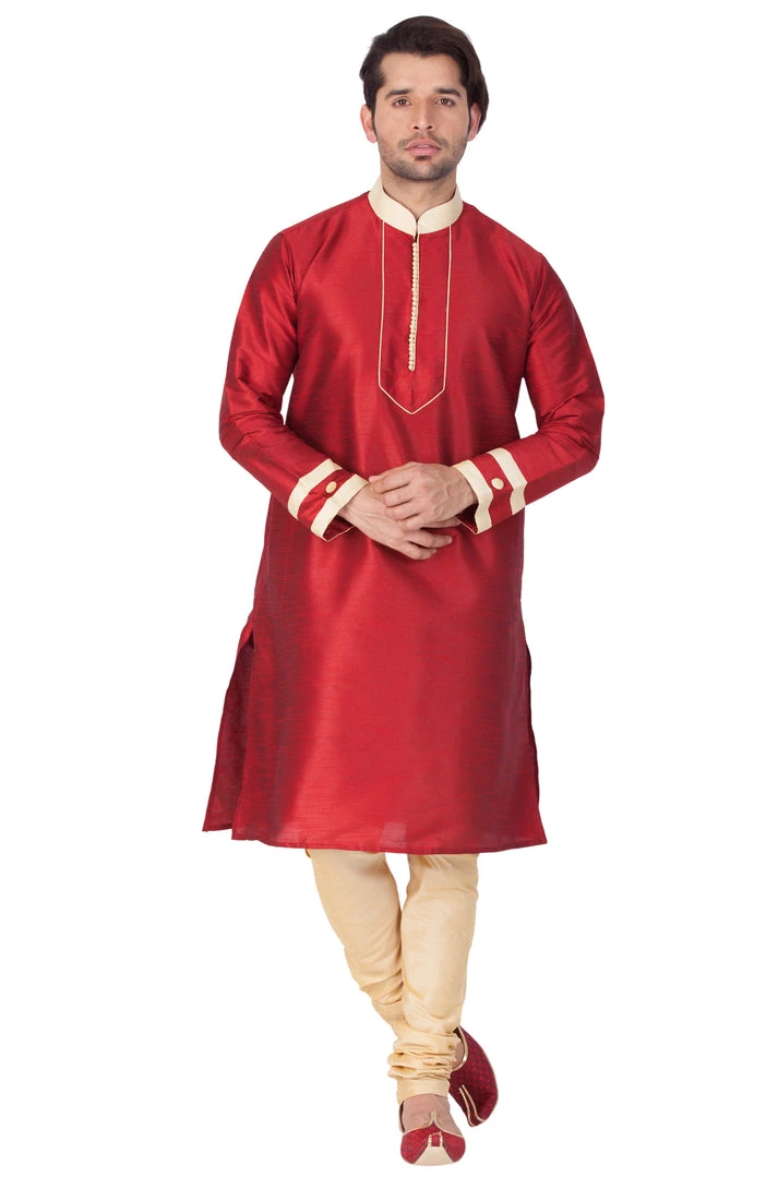 Maroon solid straight kurta, has a cream color mandarin collar, long sleeves, button placket, cream color border on sleeves, straight hem, and side slits