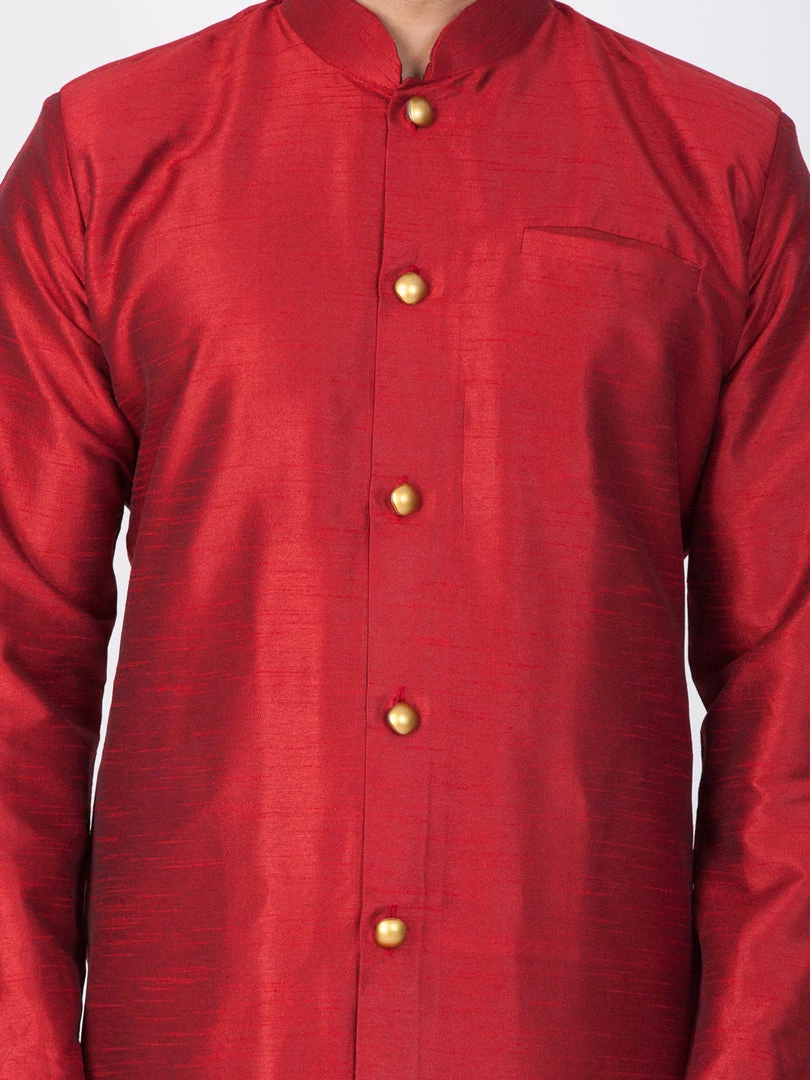 Maroon solid straight knee-length kurta, has a mandarin collar, long sleeves, full front button placket, straight hem, a welt pocket