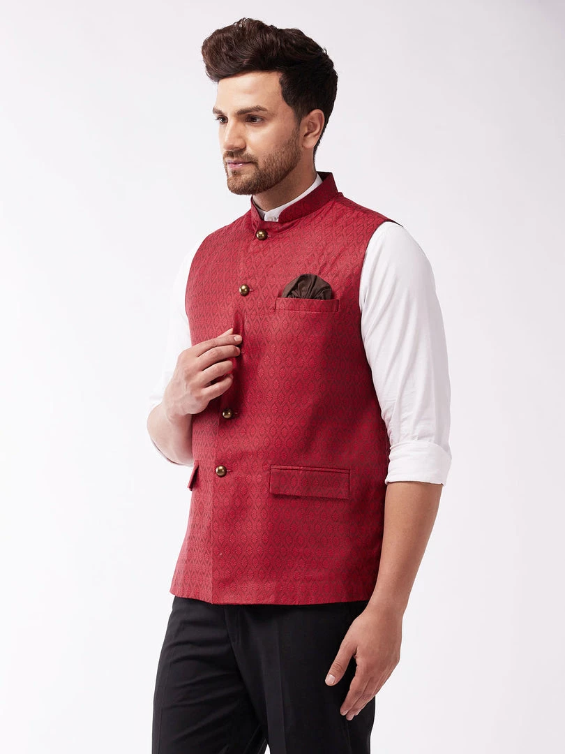 Classic silk-blend Nehru Jacket, has a mandarin collar, sleeveless, a full button placket, three pockets, straight hem. Comes with a pocket square.
