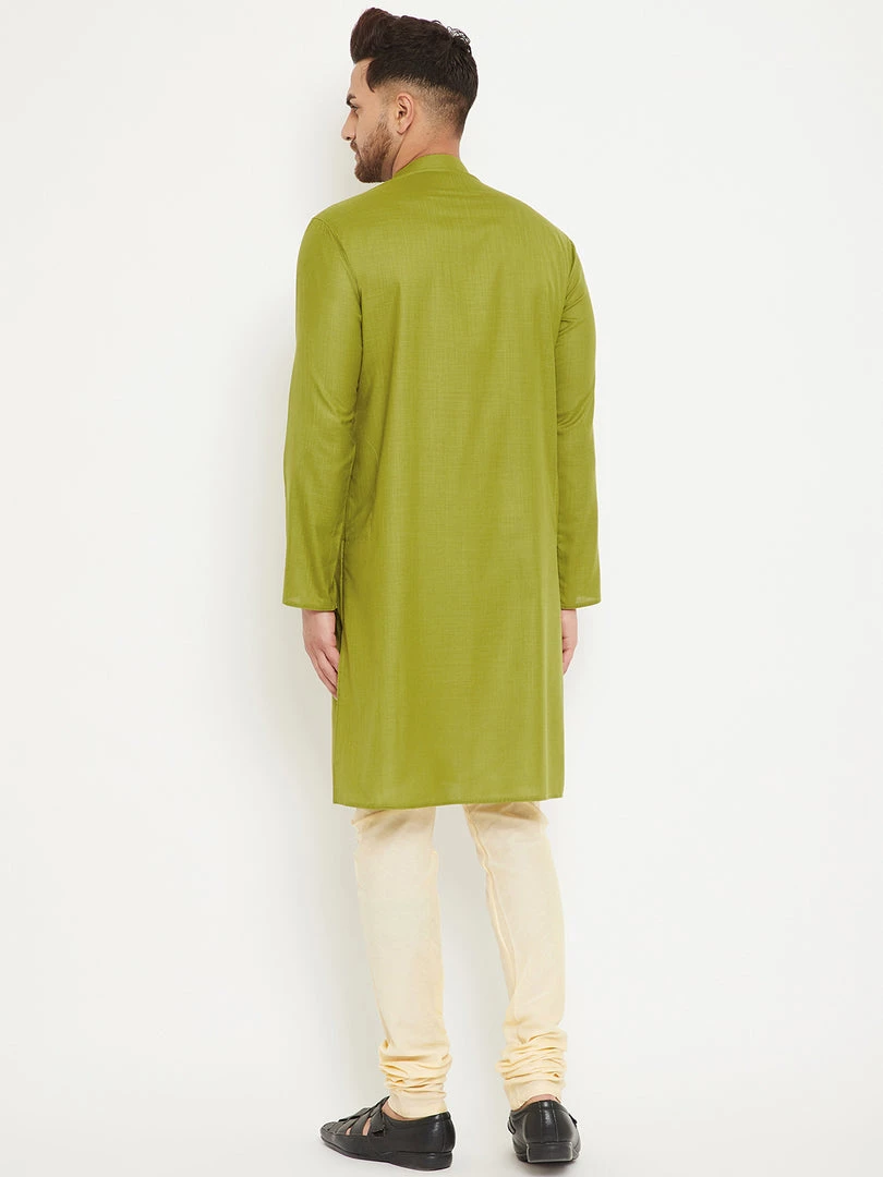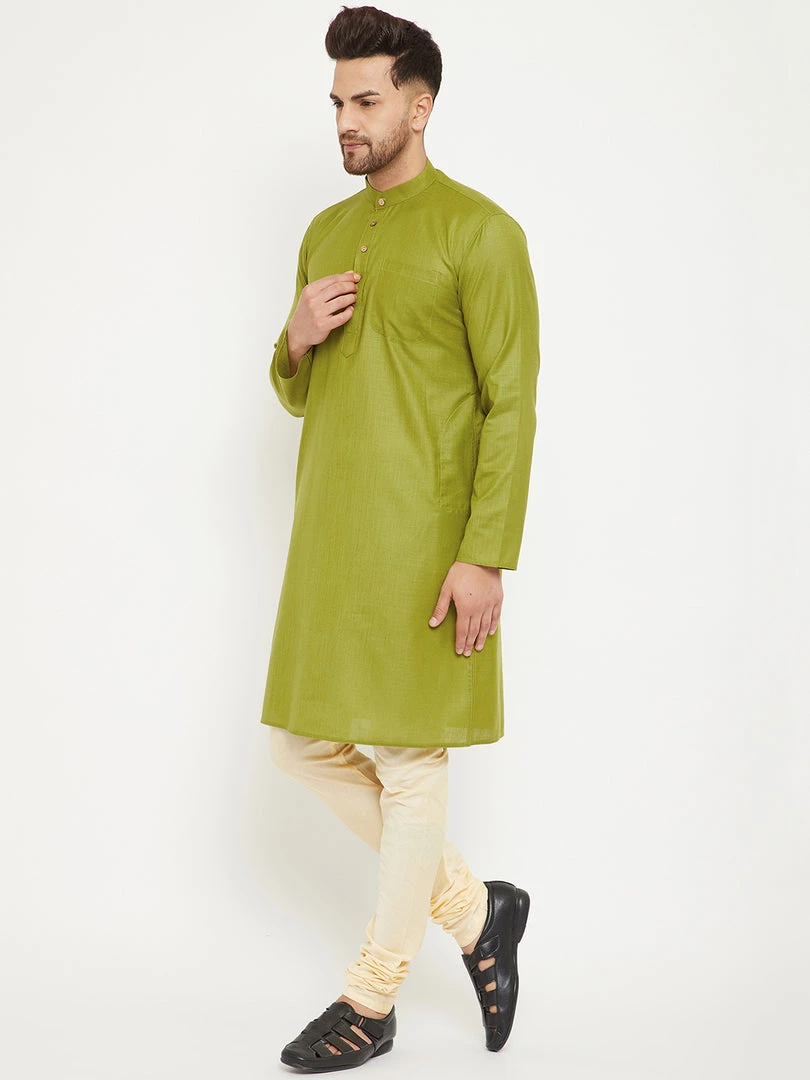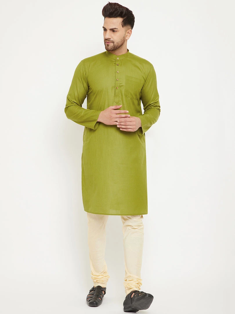 Mehndi green solid straight knee-length kurta, has a mandarin collar, wooden buttons, full sleeves, straight hem, side slits, and a patch pocket. Comes with cream solid churidar, has a drawstring closure.