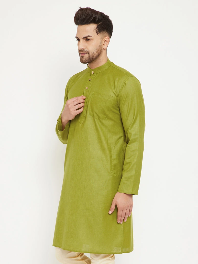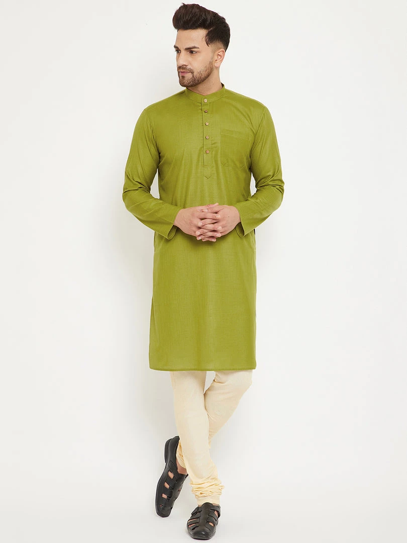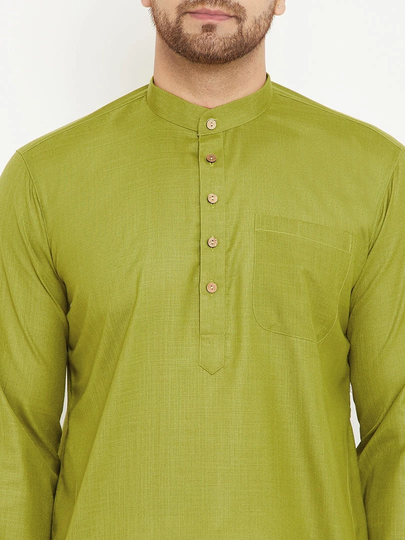 Mehndi green solid straight knee-length kurta, has a mandarin collar, wooden buttons, full sleeves, straight hem, side slits, and a patch pocket.