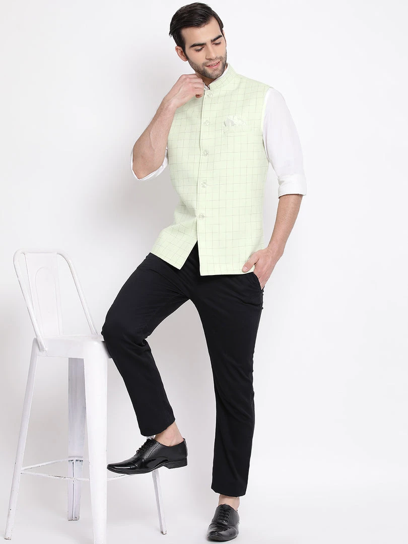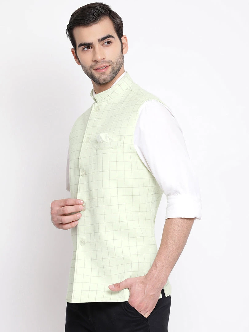 Mint green woven checked Nehru jacket, has a mandarin collar, a full button placket, sleeveless, a welt pocket