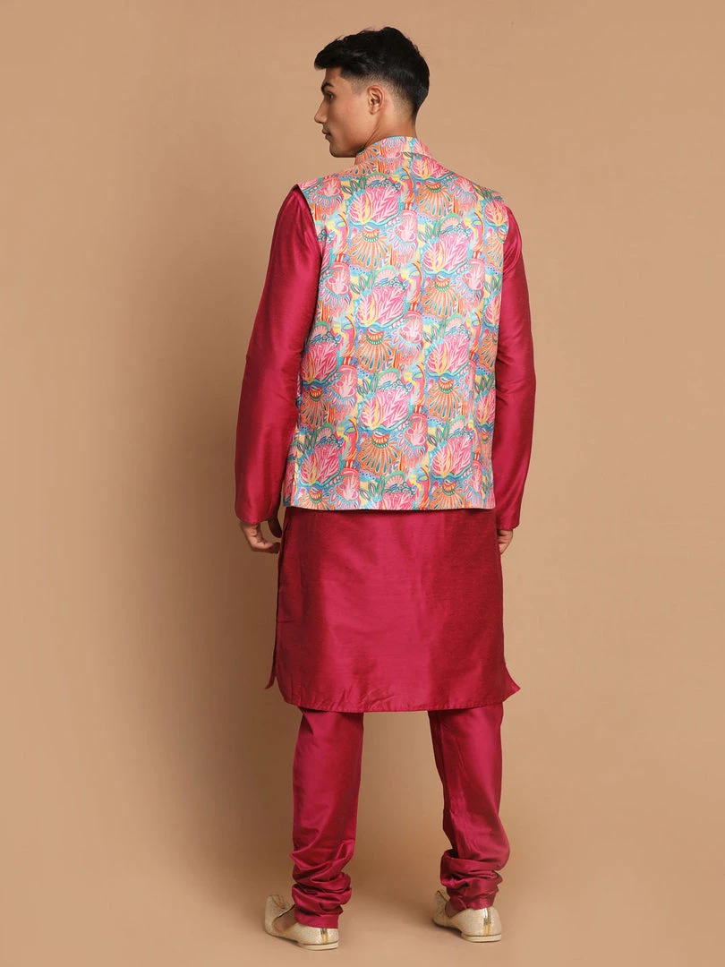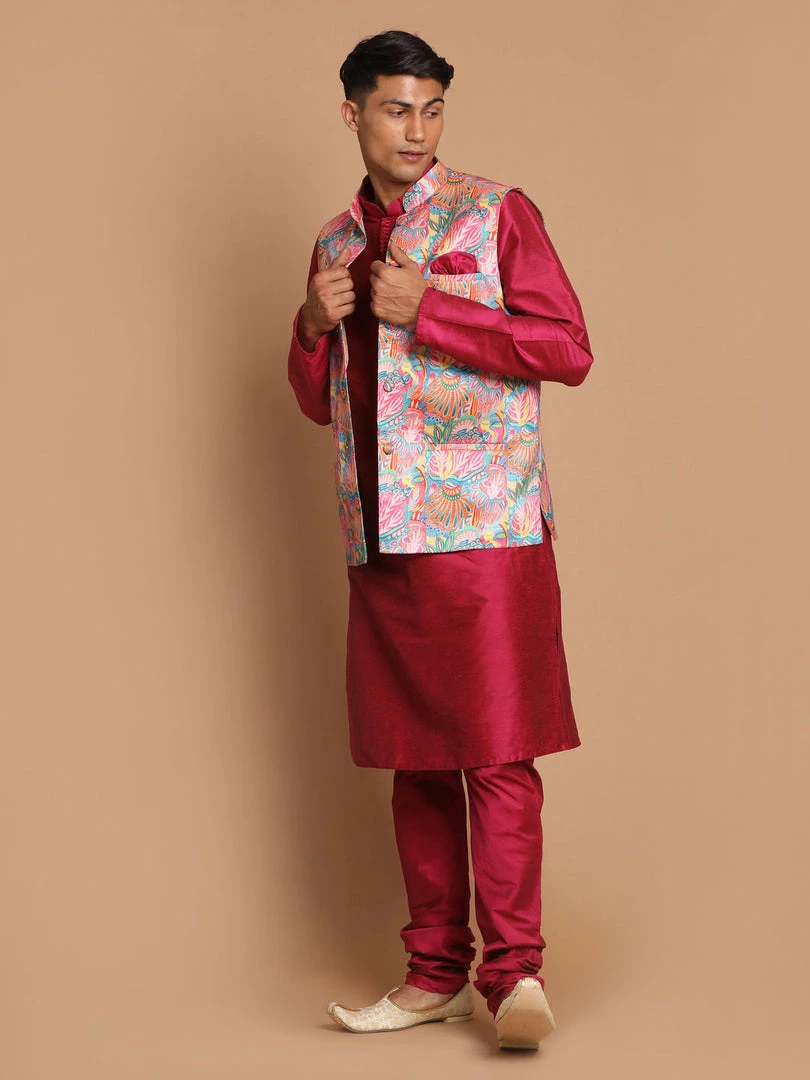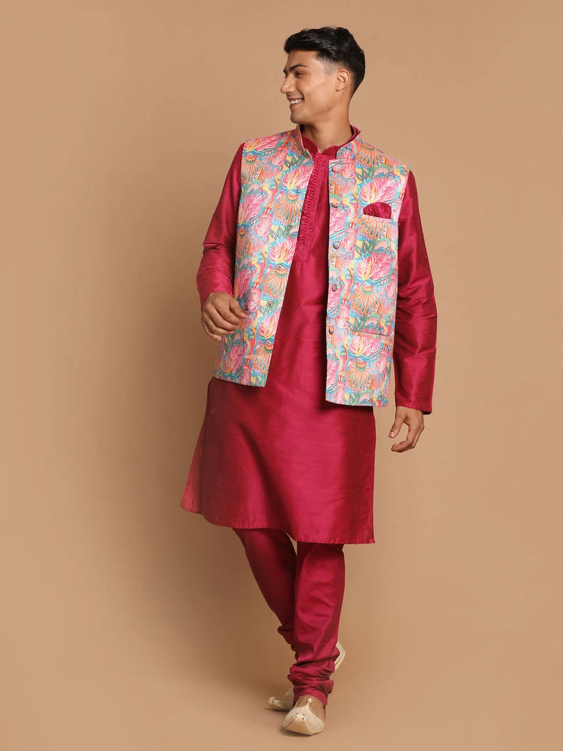 Multi-color printed nehru jacket with falsa solid kurta and pyjama set.