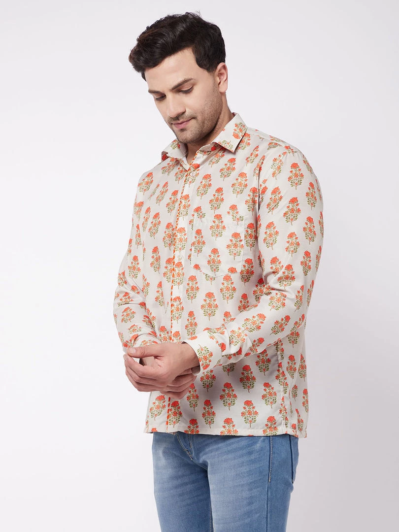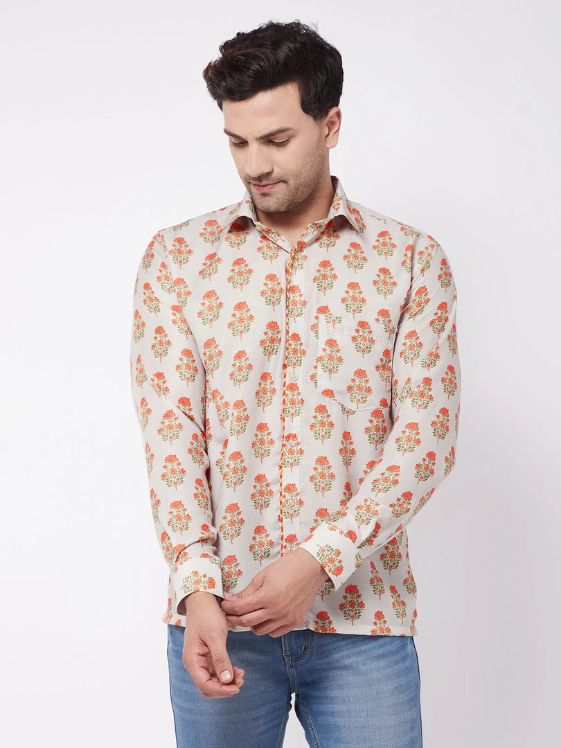 Printed semi ethnic men’s shirt, has a cut away collar, full front button placket, full sleeves with cuff, and straight hemline. Has gotta Patti border embellishment.