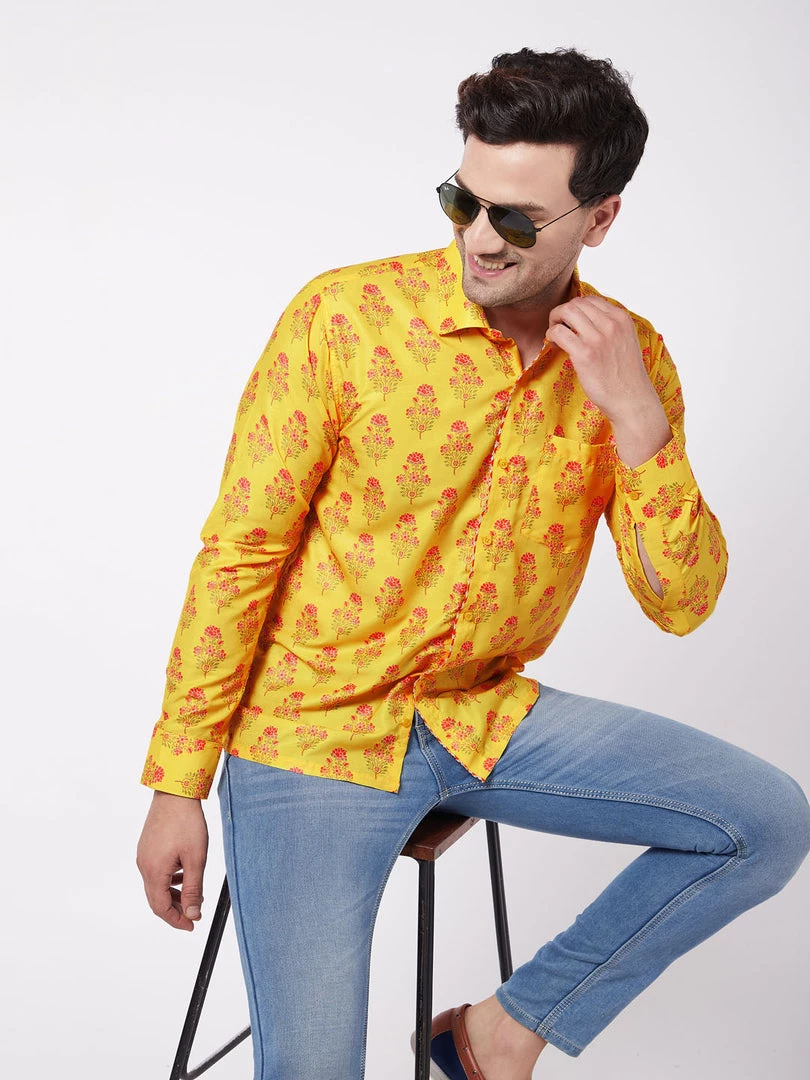 Printed semi ethnic men’s shirt, has a cut away collar, full front button placket, full sleeves with cuff, and straight hemline. Has gotta Patti border embellishment.