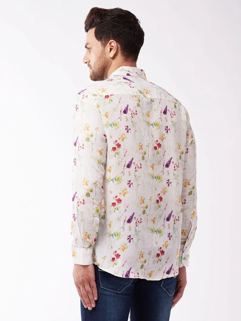 Floral printed semi ethnic men’s shirt, has a cutaway collar, full front button placket, full sleeves with cuff, and straight hemline. Has gotta Patti/singhara border embellishment.