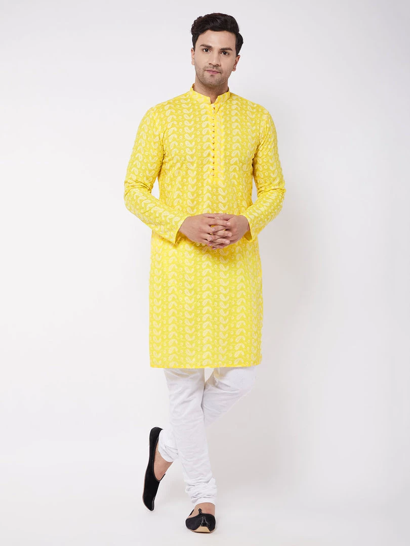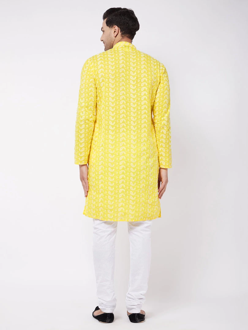 Mustard and white chikankari straight knee-length kurta, has a mandarin collar, long sleeves, button placket, straight hem, and side slits