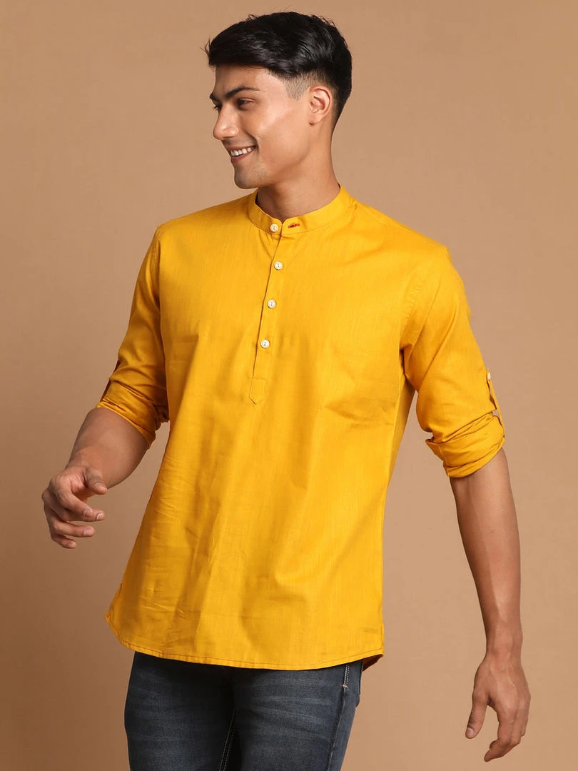 Mustard color solid short kurta, has a mandarin collar, long sleeves, straight hem, button placket