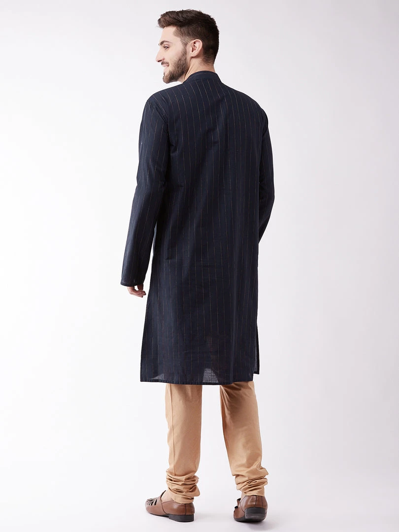 Navy Blue cotton blend woven straight knee-length kurta, has a mandarin collar, button placket, long sleeves, a straight hem, and side slits. Comes with a rose gold solid churidar, has a drawstring closure.