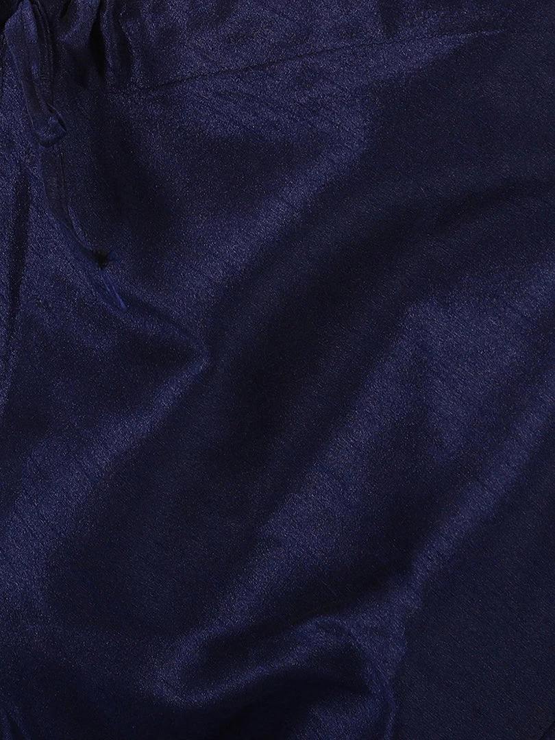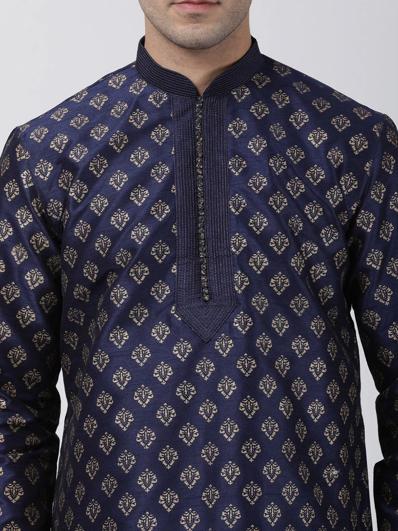 Navy Blue Woven straight knee-length kurta, has a mandarin collar, long sleeves, straight hem.