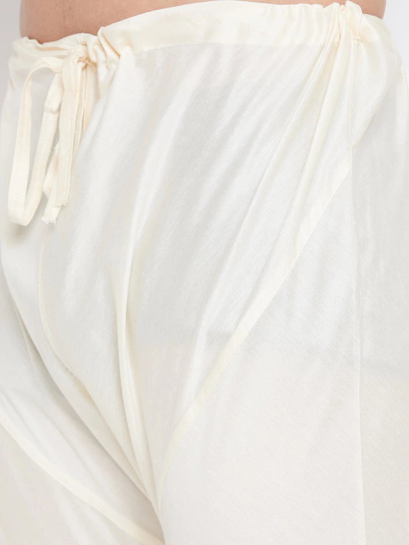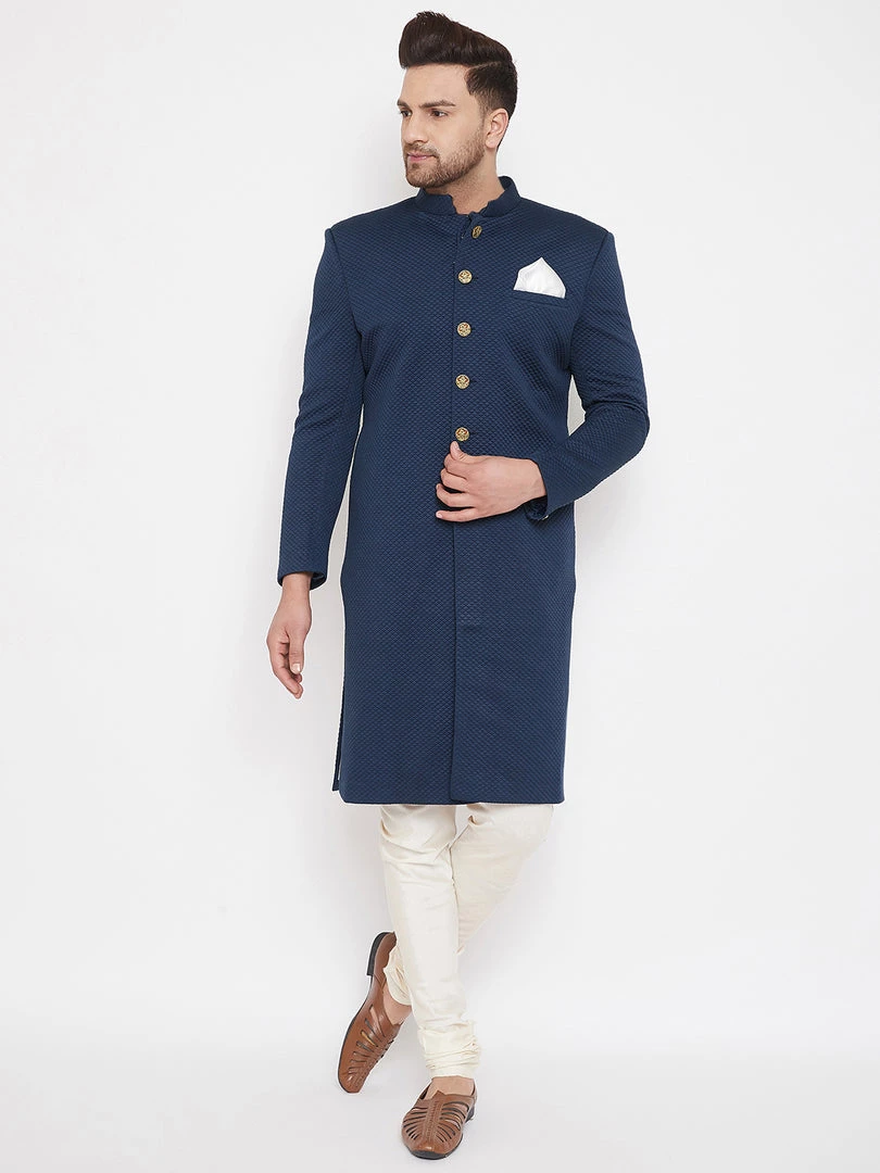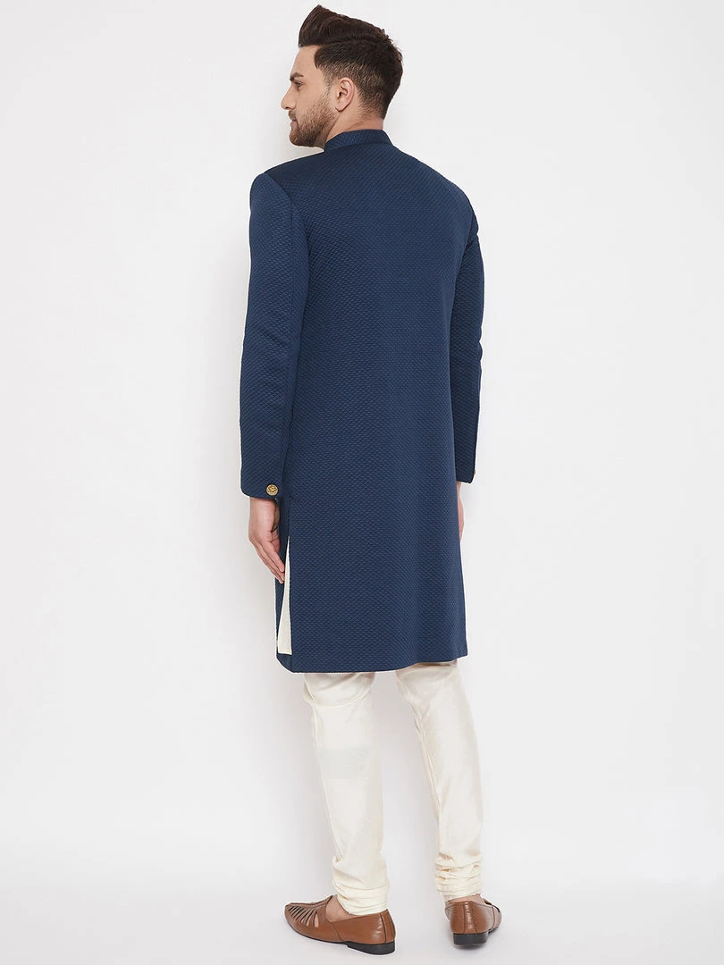 Navy Blue solid Sherwani, has a mandarin collar, long sleeves, full front button placket, straight hem and a welt pocket. Comes with pocket square. Cream solid churidar, has drawstring waistband and slip on closure