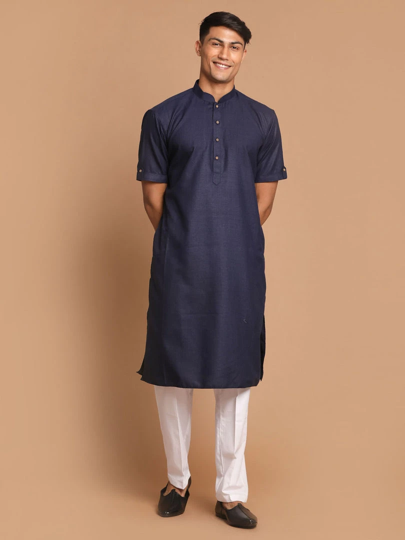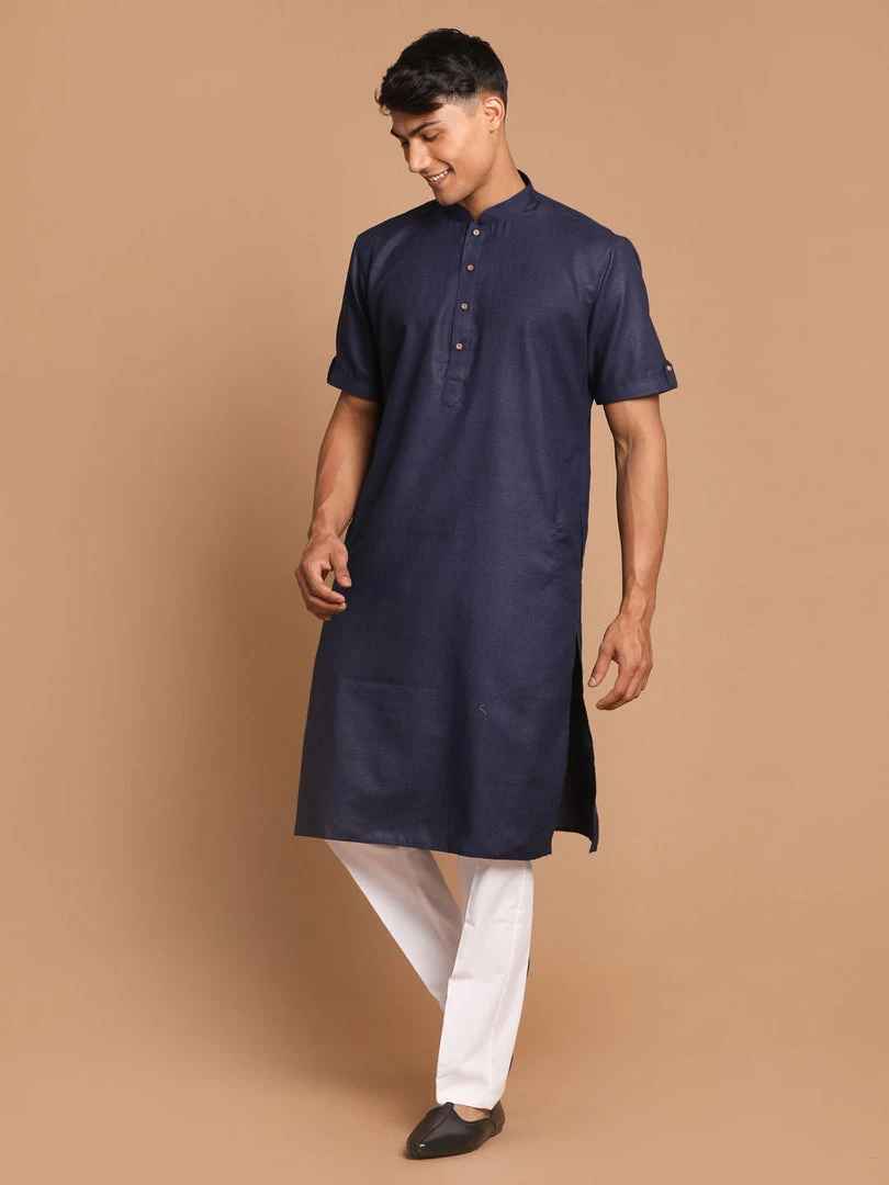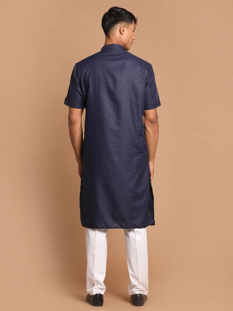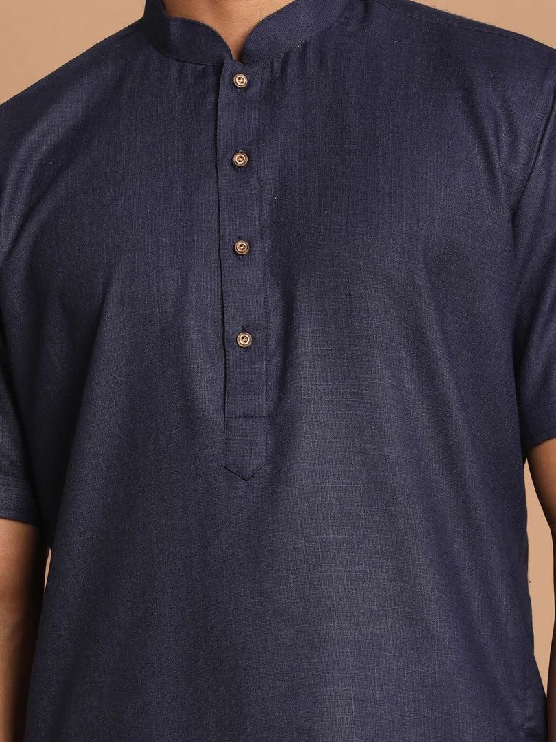 Navy Blue color solid straight knee length kurta, has a mandarin collar, short sleeves, button placket, straight hem.