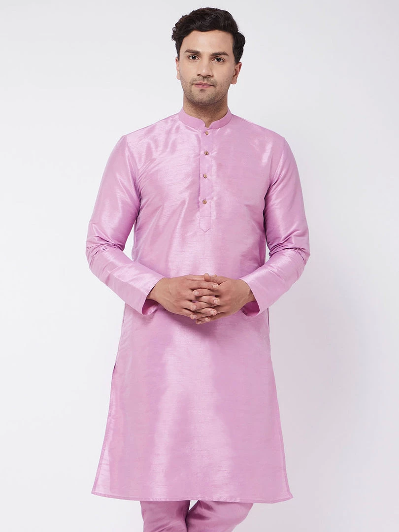 Onion pink solid textured straight knee-length silk blend kurta, has a mandarin collar, long sleeves, button placket, a straight hem, and side slits.