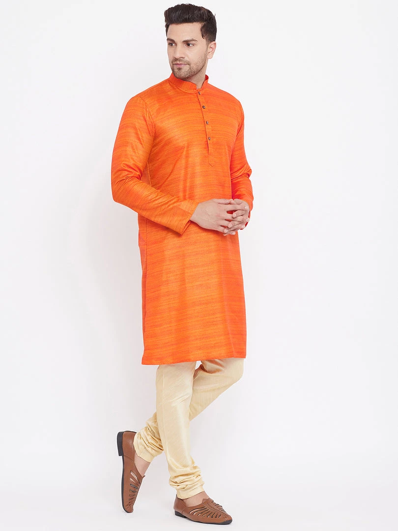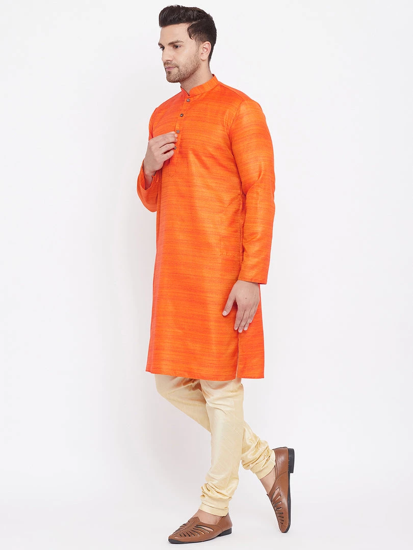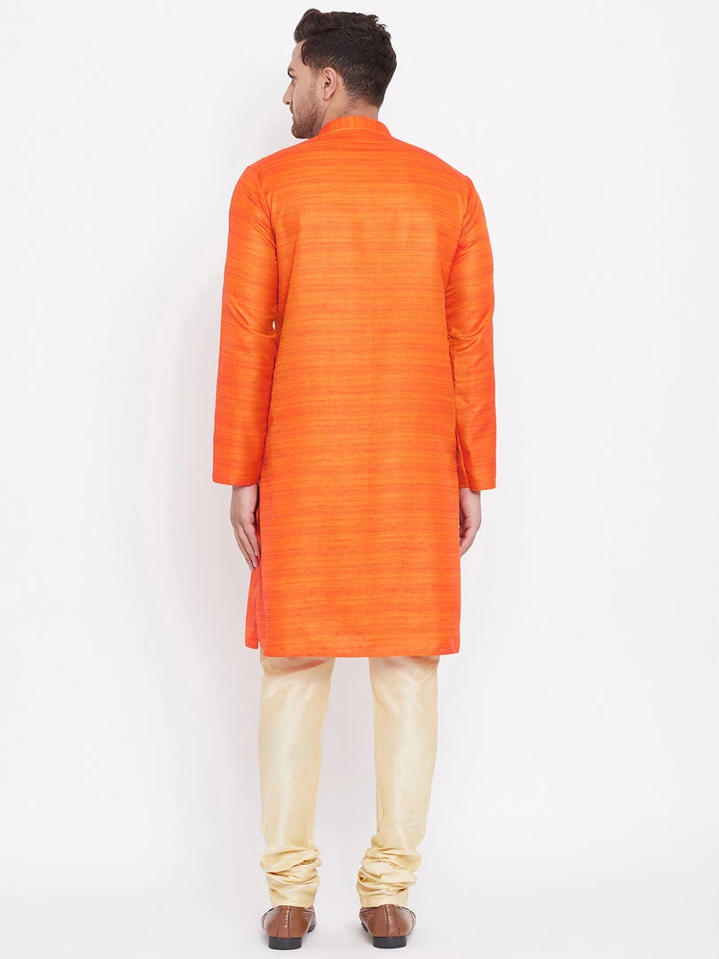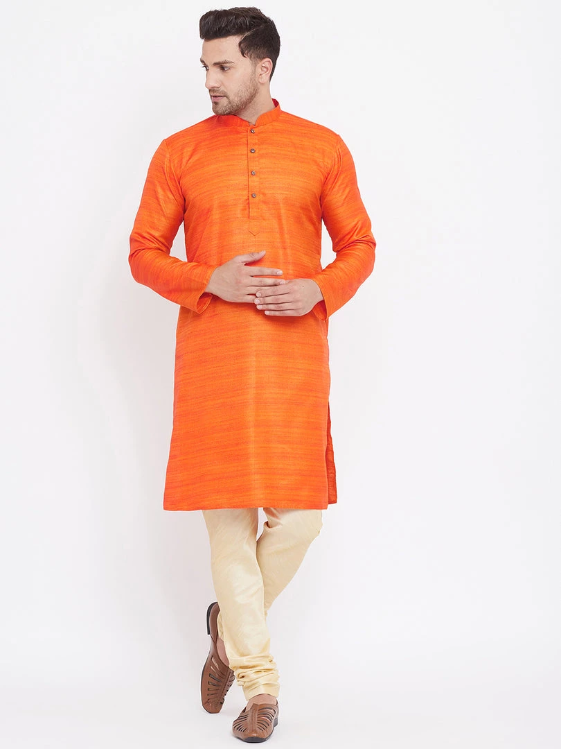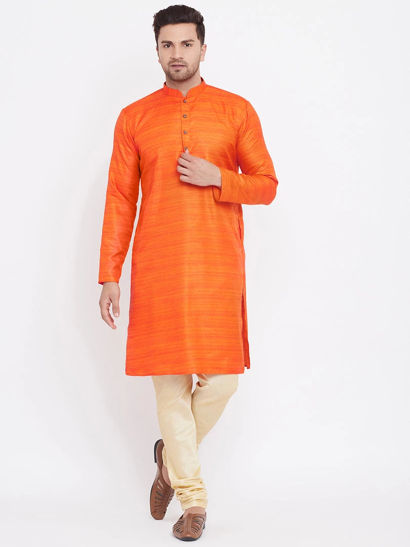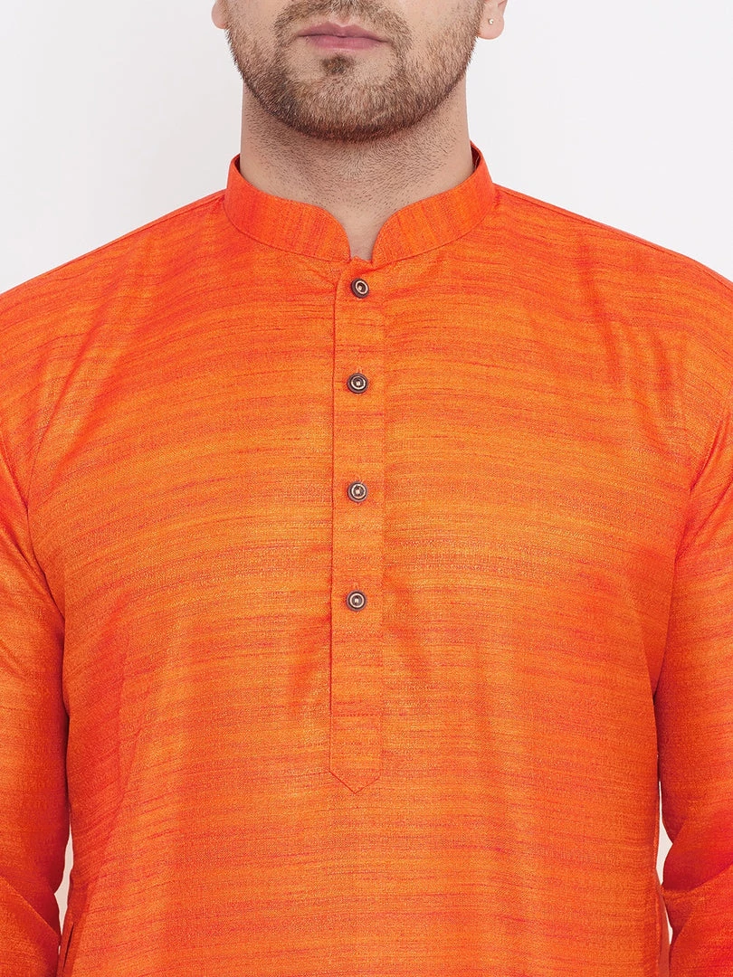 Orange silk blend straight knee length kurta, has a mandarin collar, long sleeves, button placket, straight hem.