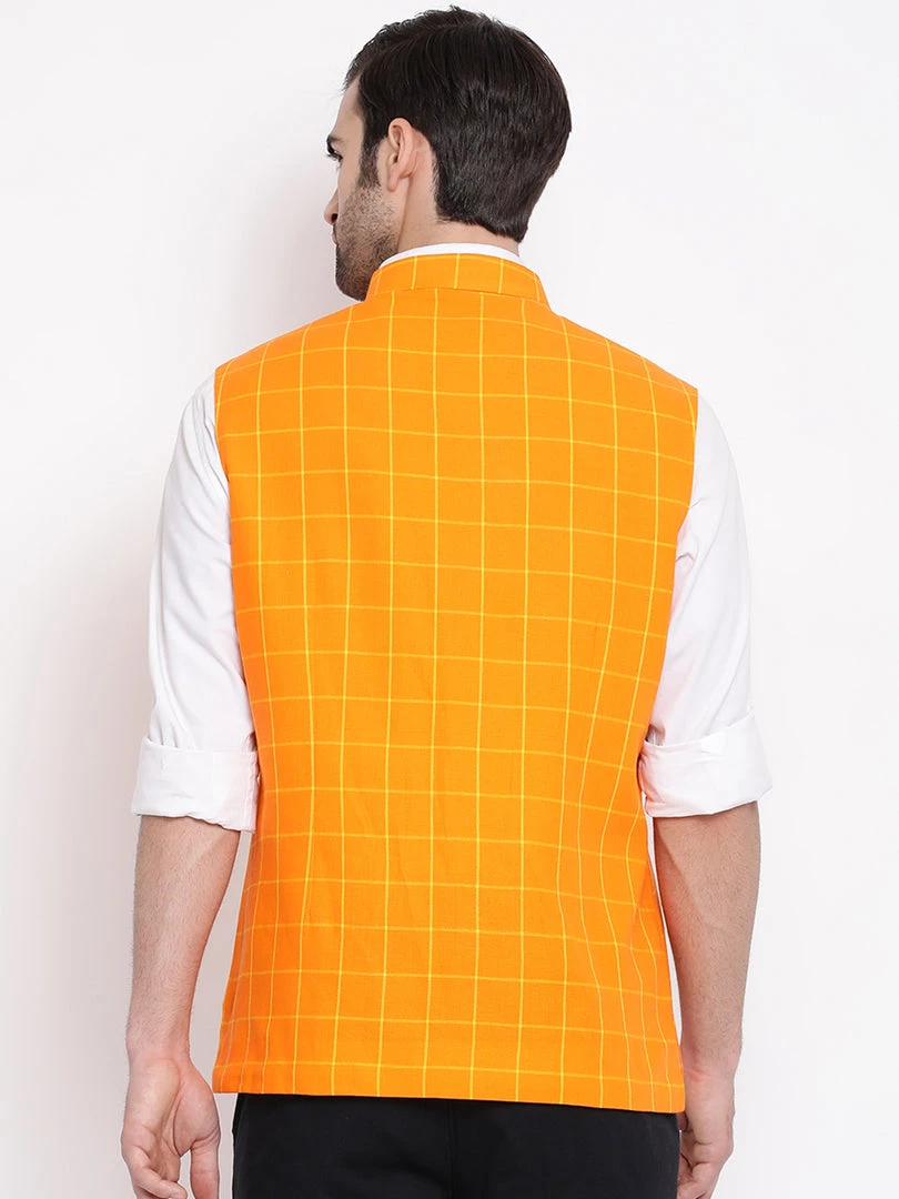 Orange woven checked Nehru jacket, has a mandarin collar, a full button placket, sleeveless, three welt pockets
