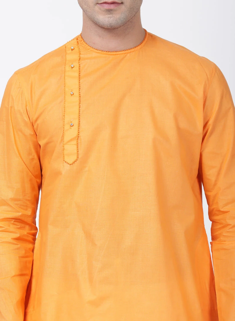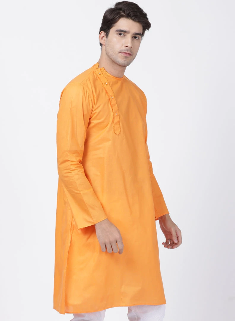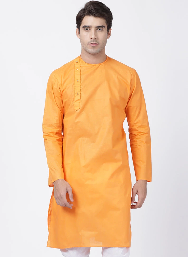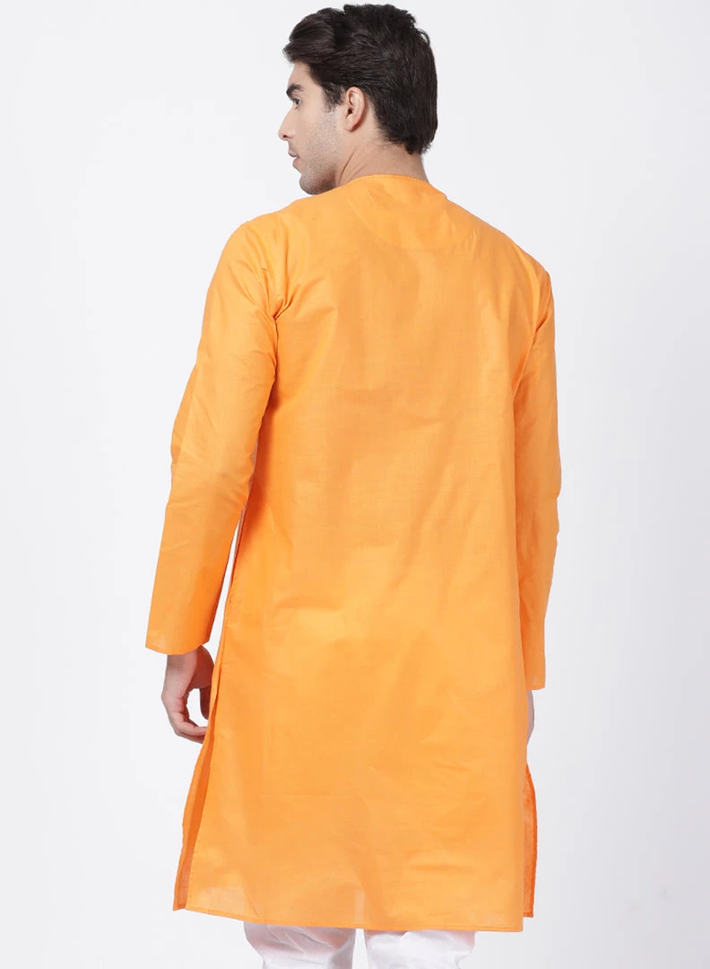 Orange solid straight kurta, has a round neck, long sleeves, side button placket, straight hem, and side slits